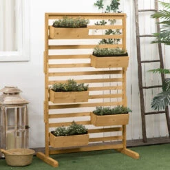 Outsunny Wood Privacy Screen W/ 4 Planter Box, Raised Bed W/ 3 Panels & Drainage Holes