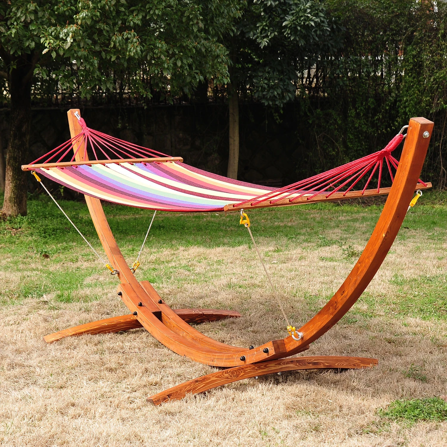 Create a stunning, contemporary look in your own backyard while relaxing under the sun or stars with your Outsunny hammock bed. After a quick initial setup, grab a drink and take the rest of the day off because once you settle in you won’t want to leave. The combination of style and durability will make you wonder how you ever did without this beautiful hammock with stand. It is made from sustainable bent-hardwood which has been stained, laminated and weather treated.