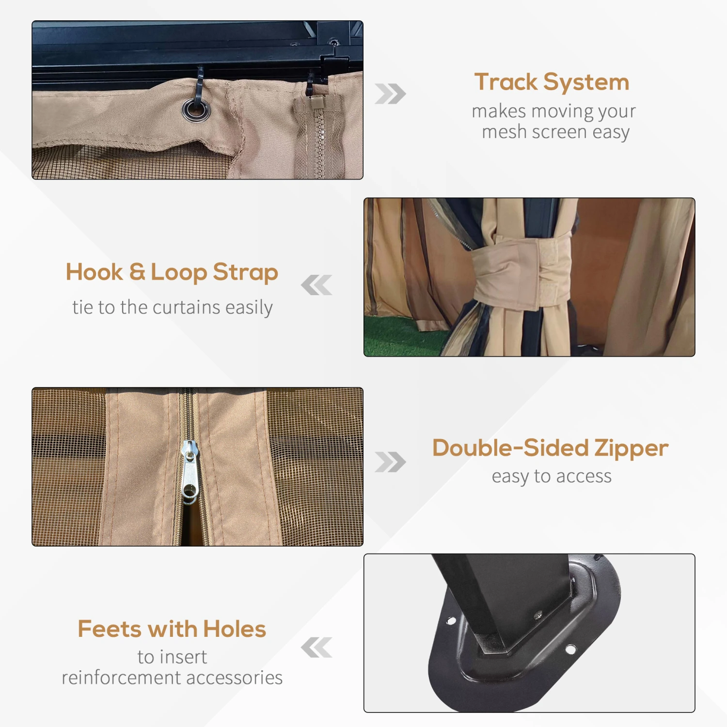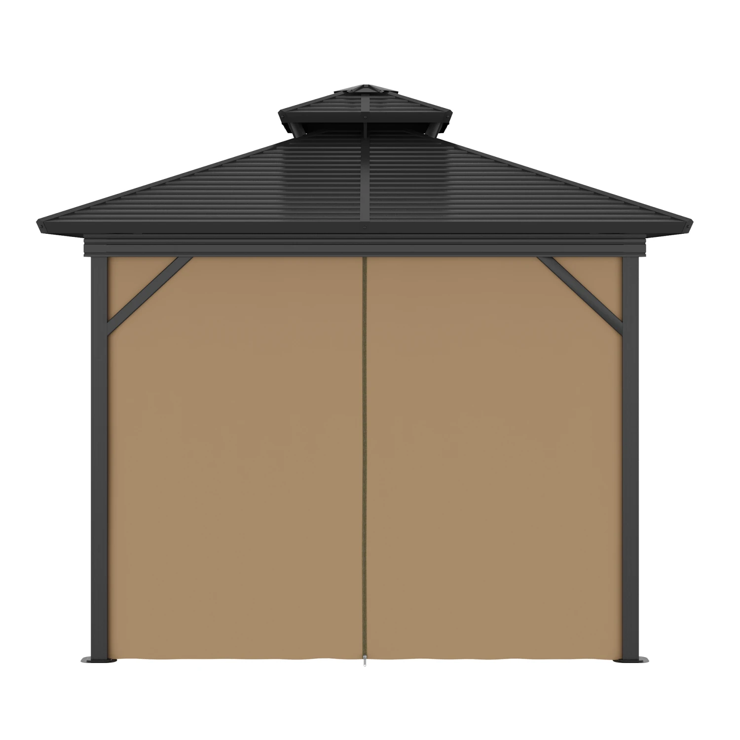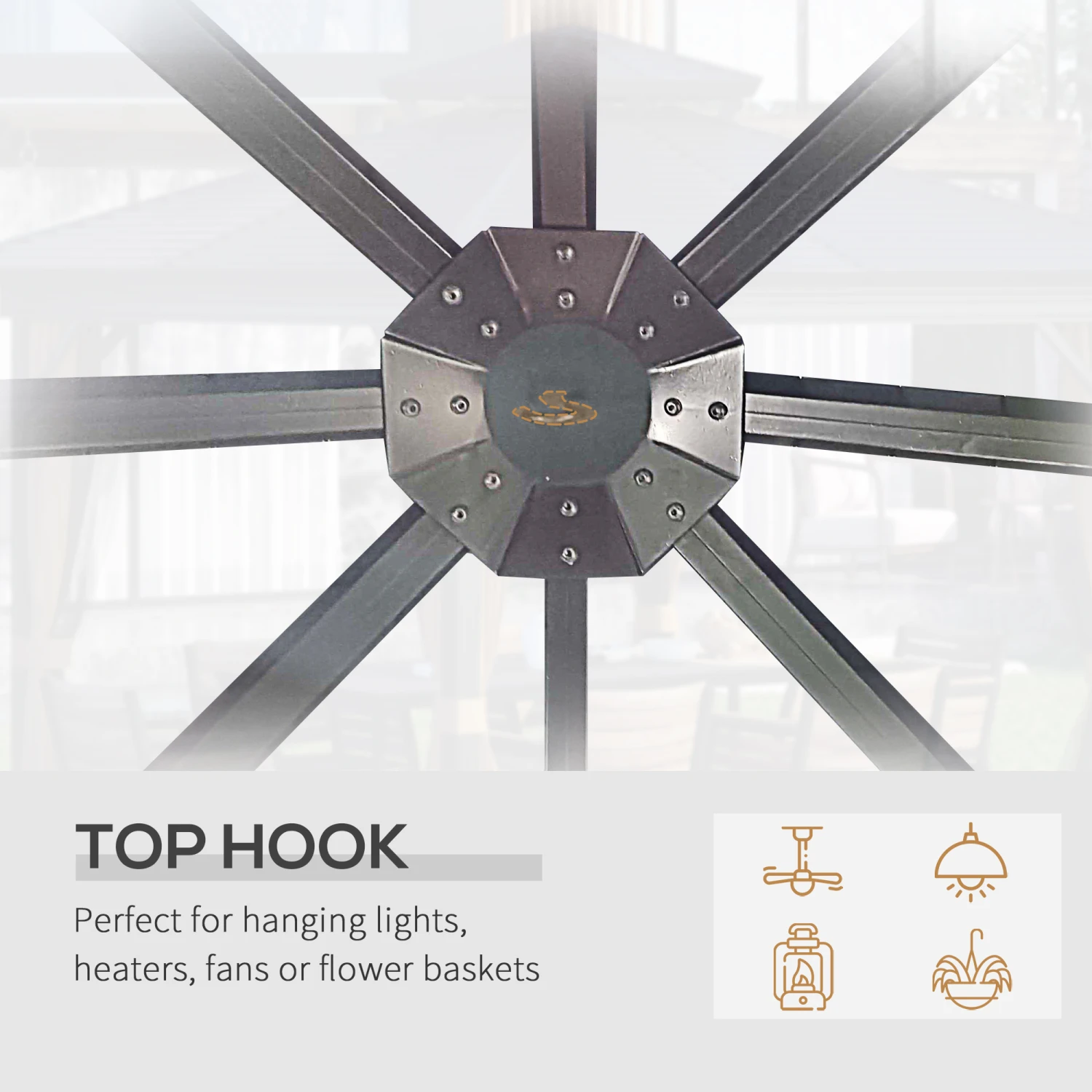 An easy-to-carry yet heavy-duty hardtop gazebo. Its aluminum frame and steel roof are water-safe and weather strong. Let the good in; keep the bad out. Use the four zip-on mesh nettings and sidewalls to master the elements. Stop sunburns and stay dry by blocking UV and rain. Redirect wind and keep cool with its stylish two-tier steel roof. The party doesn’t end at sundown; hang lights, or lanterns, from the ceiling. Whether it’s placed on soft or hard ground, Outsunny has you covered.