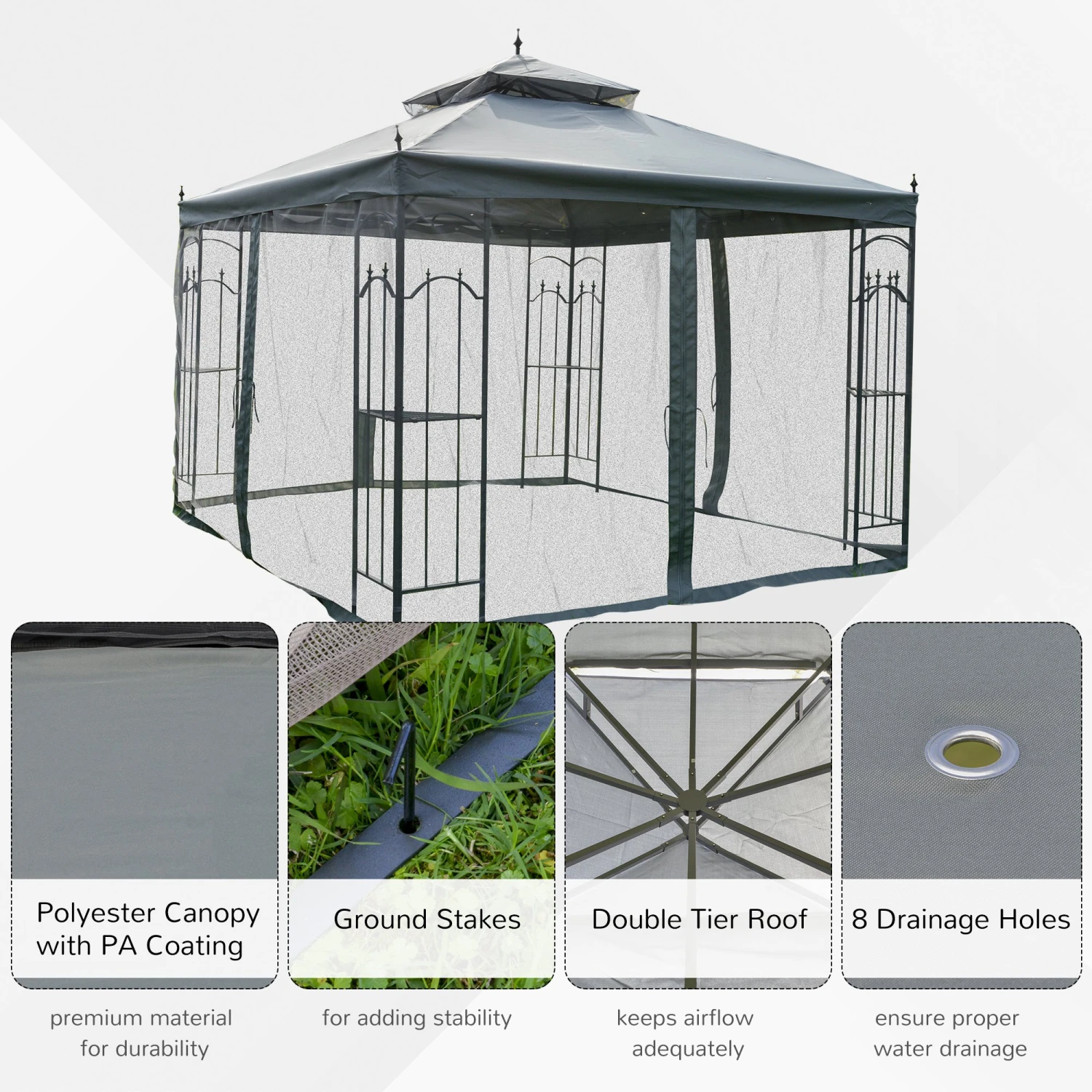 Our 10×10 deck gazebo has reinforced corners and a peppering of arrow tip motifs, making it an excellent accent piece for a wedding or other events. Each corner comes with shelves to place plants or other decorations. It has a two-tier canopy that adds aesthetics and helps it redirect wind flow for a more stable design. This canopy, like its sidewalls, allows in the breeze, filtering out those unwanted winged friends. Get out, get comfy, get Outsunny.