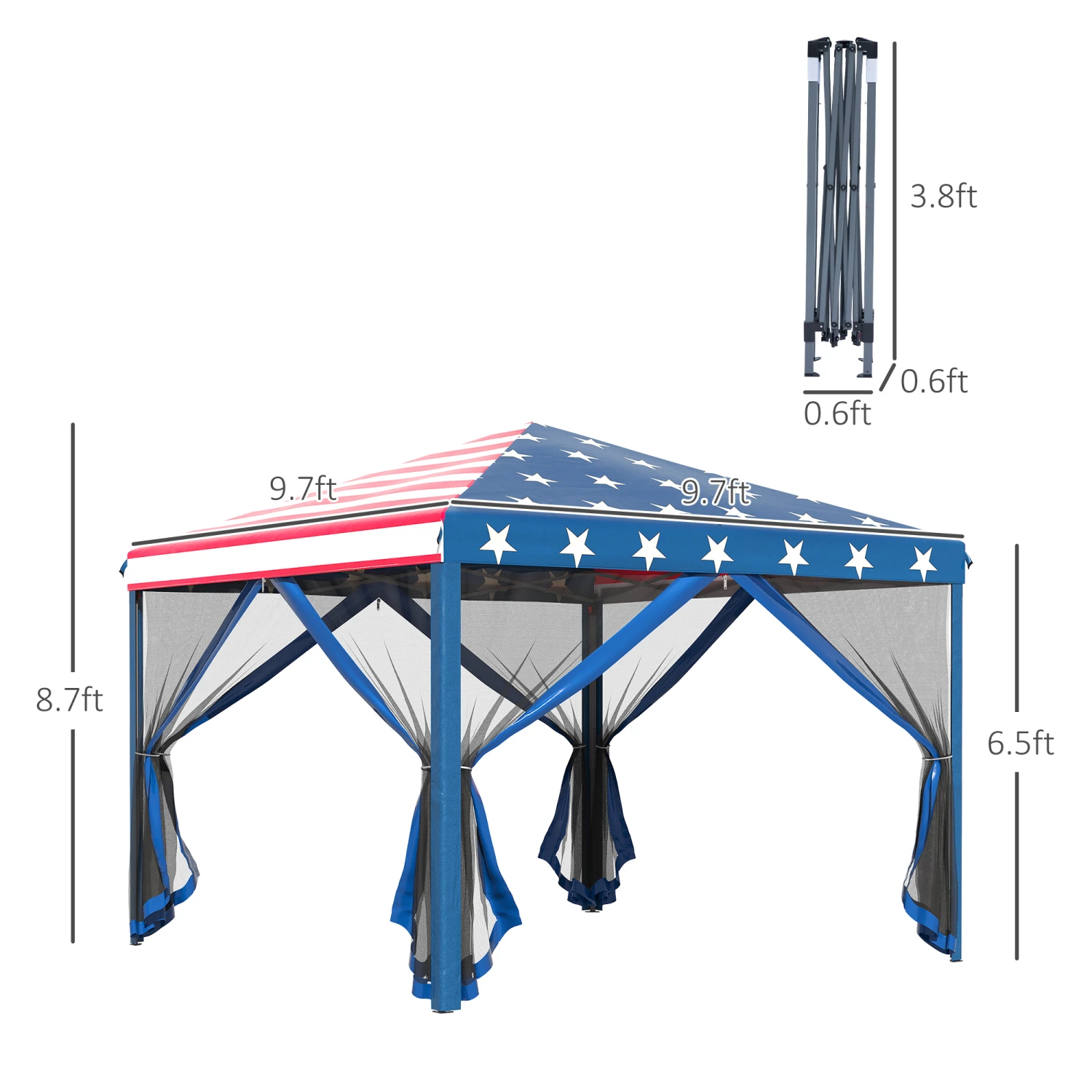 - – Overall Dimensions: 10′ L x 10′ W x 8.7′ H