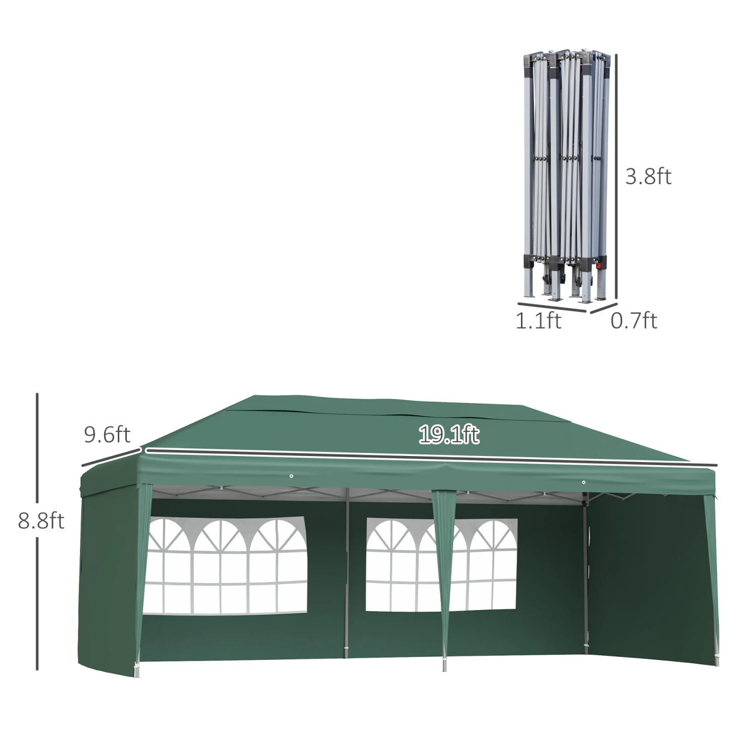 - – Product Dimensions (Feet): 19.1’L x 9.6’W x 8.8’H