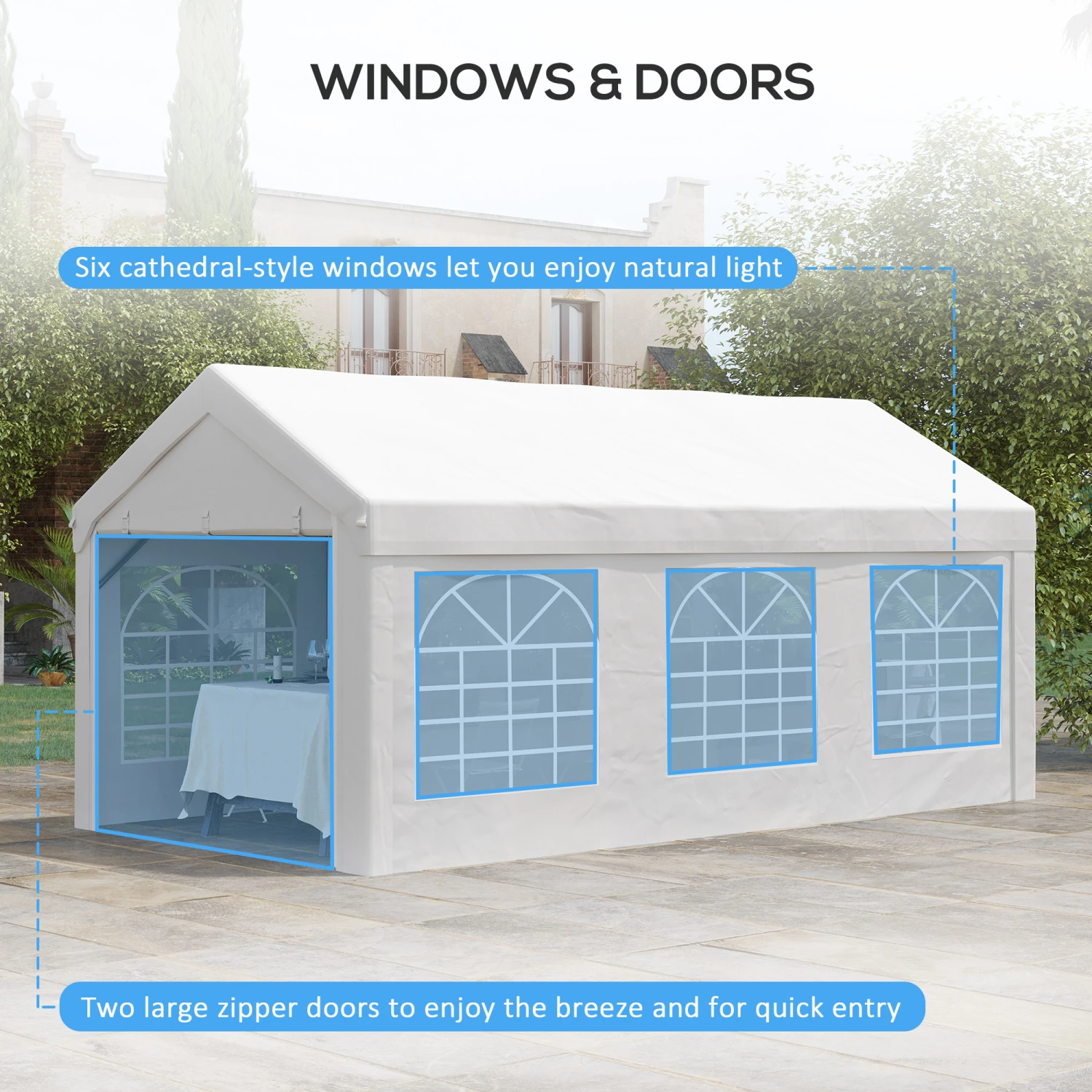 - – Six stylized cathedral-style PVC windows make it great for hosting events/catering