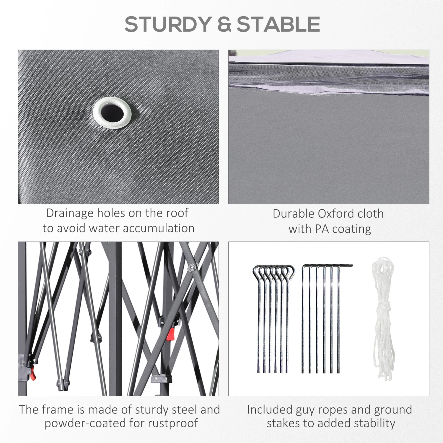 Pop-in, pop-up, and pop-out with Outsunny. The pop up canopy tent is the convenient way to provide shade and shelter. Featuring zippered sidewalls, the outdoor canopy tent lets the good in and keeps the bad out. Withstand wind using four included support stakes and two-tier roof. With pop-up setup It’s great for caters; use it for events like weddings, barbeques, and graduations. When you’re done, push the outdoor canopy tent down into the carrying bag, and you’re ready to move it and store.