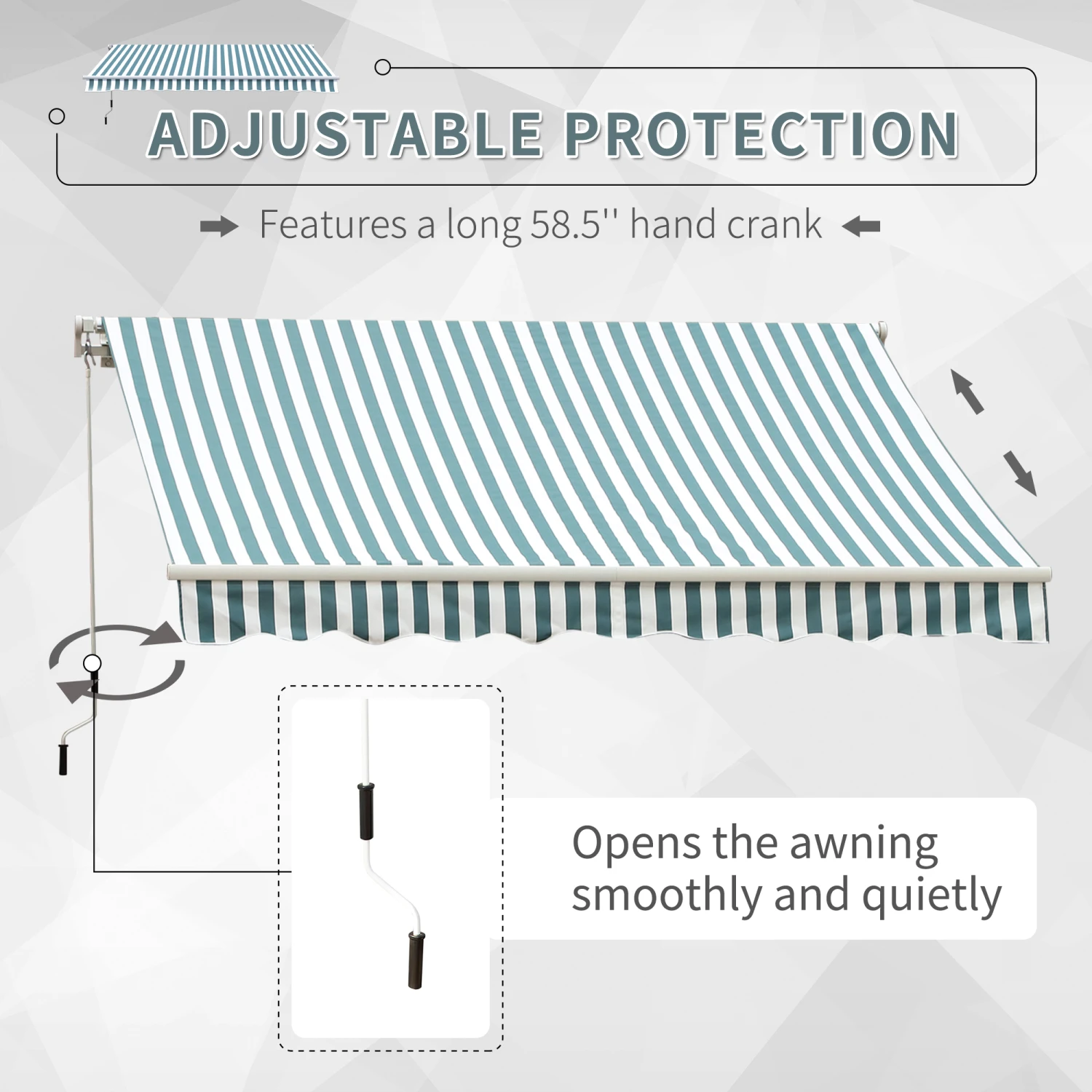With its sturdy aluminum and solid steel frame, the Outsunny retractable awnings for patio are ideal for creating shade. The reinforced frame and polyester fabrics make the porch awning superior in material and excellent in artistry. It can be easily mounted on the wall with the included accessories. Our patio awnings will create a friendly and relaxed place on your porch or patio and protect you from harmful UV rays. Enjoy both beauty and protection with this Outsunny door awning.