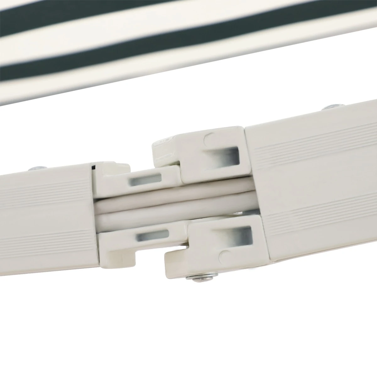 - – Polyester fabric supported by 2 retractable arms, reel, and a front support bar