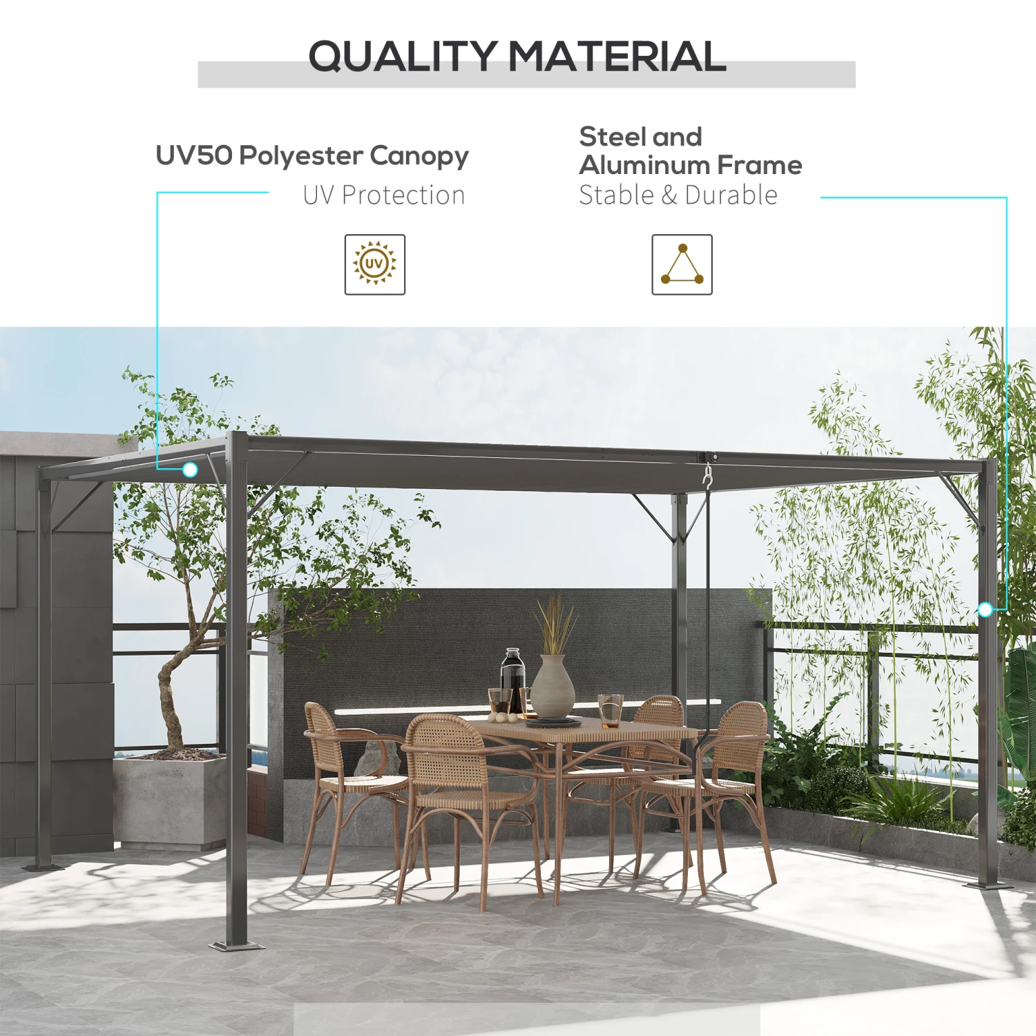 - – 180° louvered roof protects guests and furniture from UV damage
