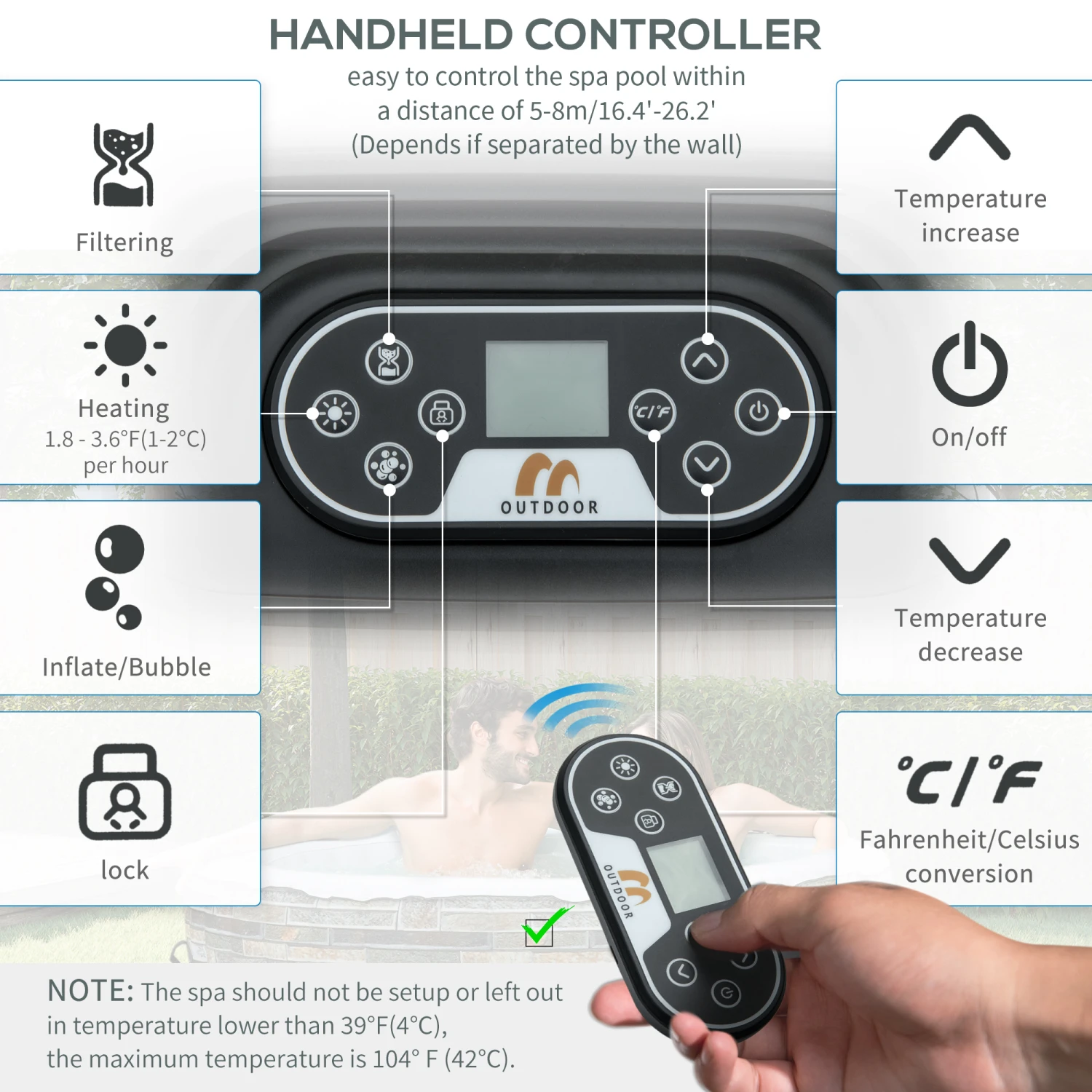 - – Spa should not be setup or left out when outdoor temperature lower than 39°F