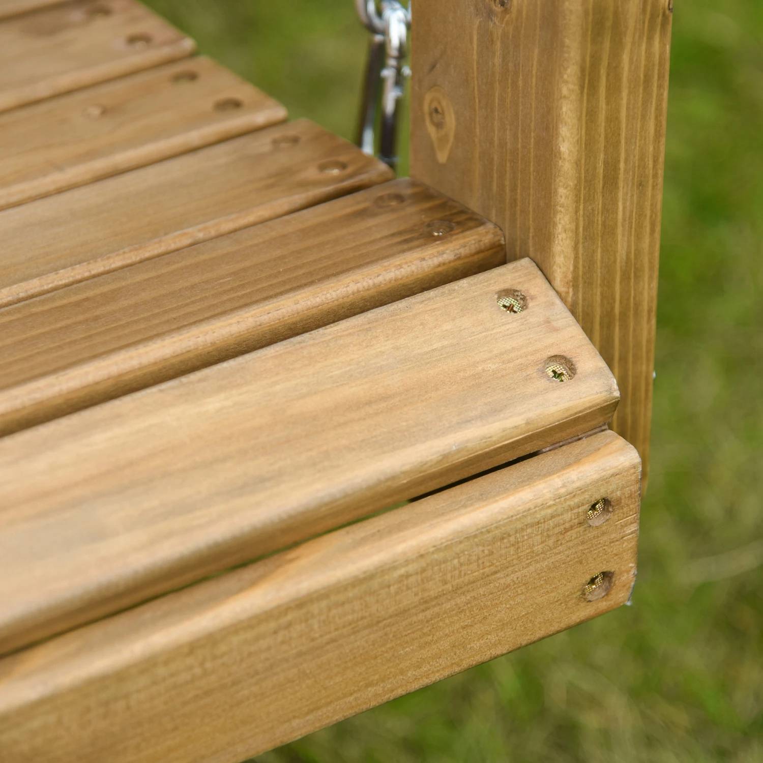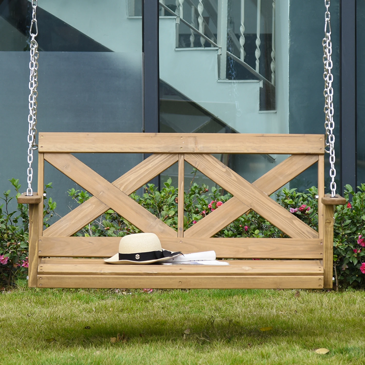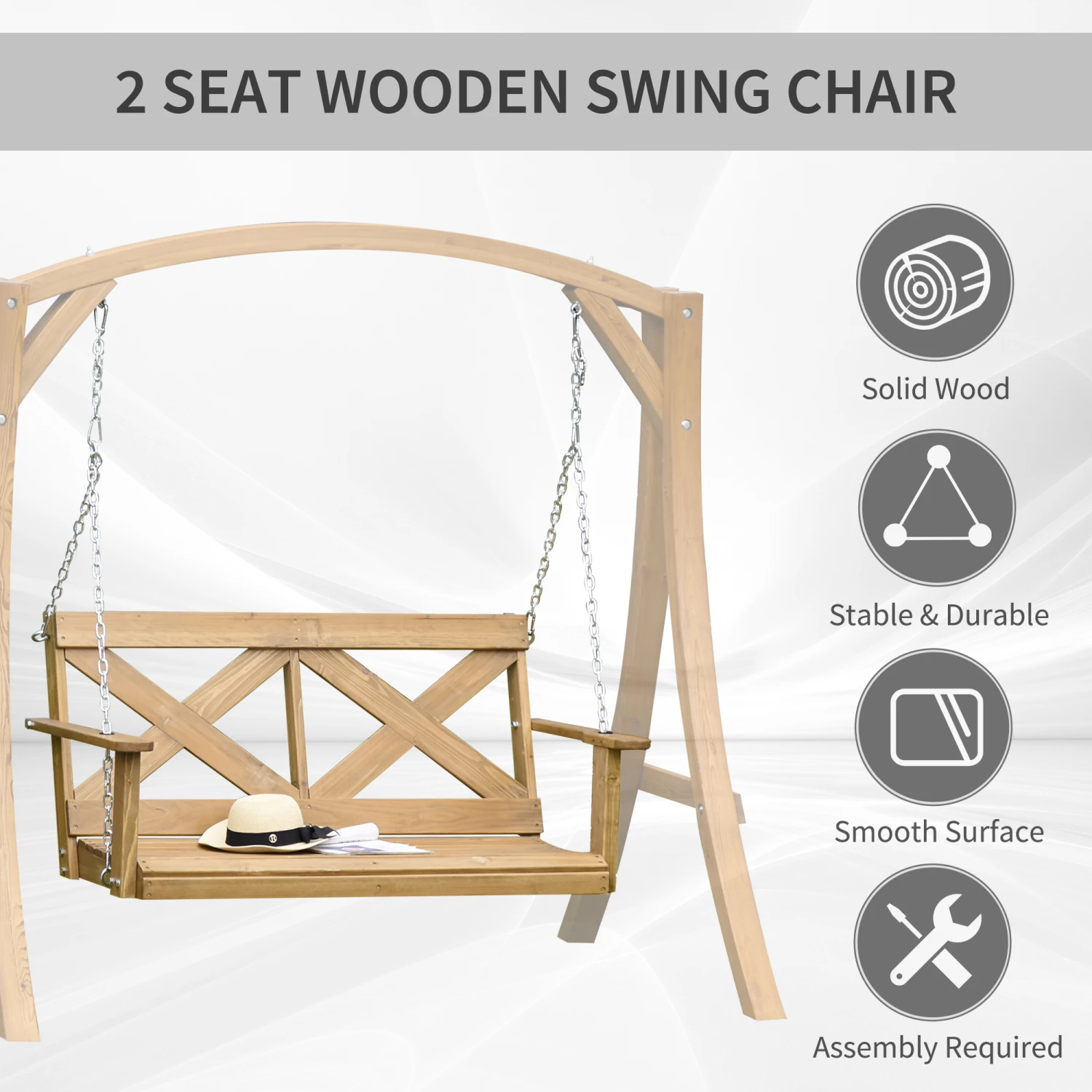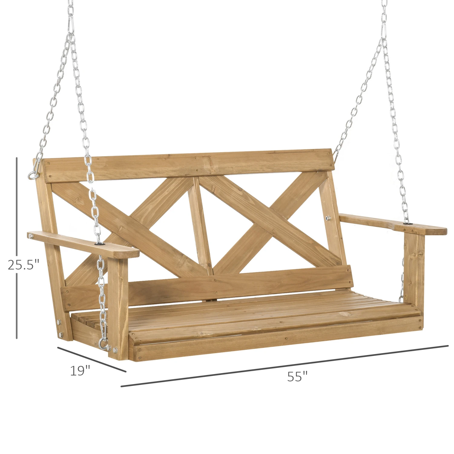 Create your own garden getaway with Outsunny. This hanging porch swing offers a wide and spacious two-person seat so you can enjoy the fresh air and autumn breeze with a friend. Its solid fir wood frame is sealed to waterproof its surface while accenting the natural woodgrain pattern. A homage to the porch swings of the past, it features an “X” motif, giving off the air of a country estate. Enjoy an armrest on each side and sit close on a loveseat-like design. Get out, get comfy, get Outsunny.