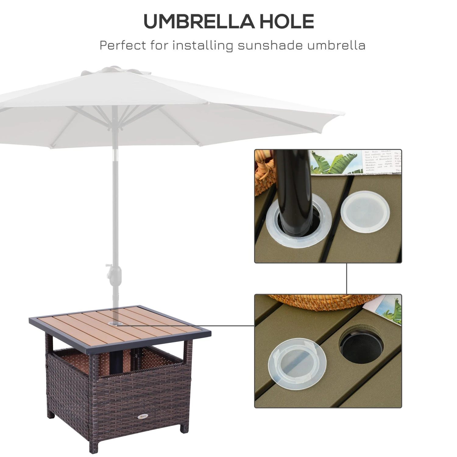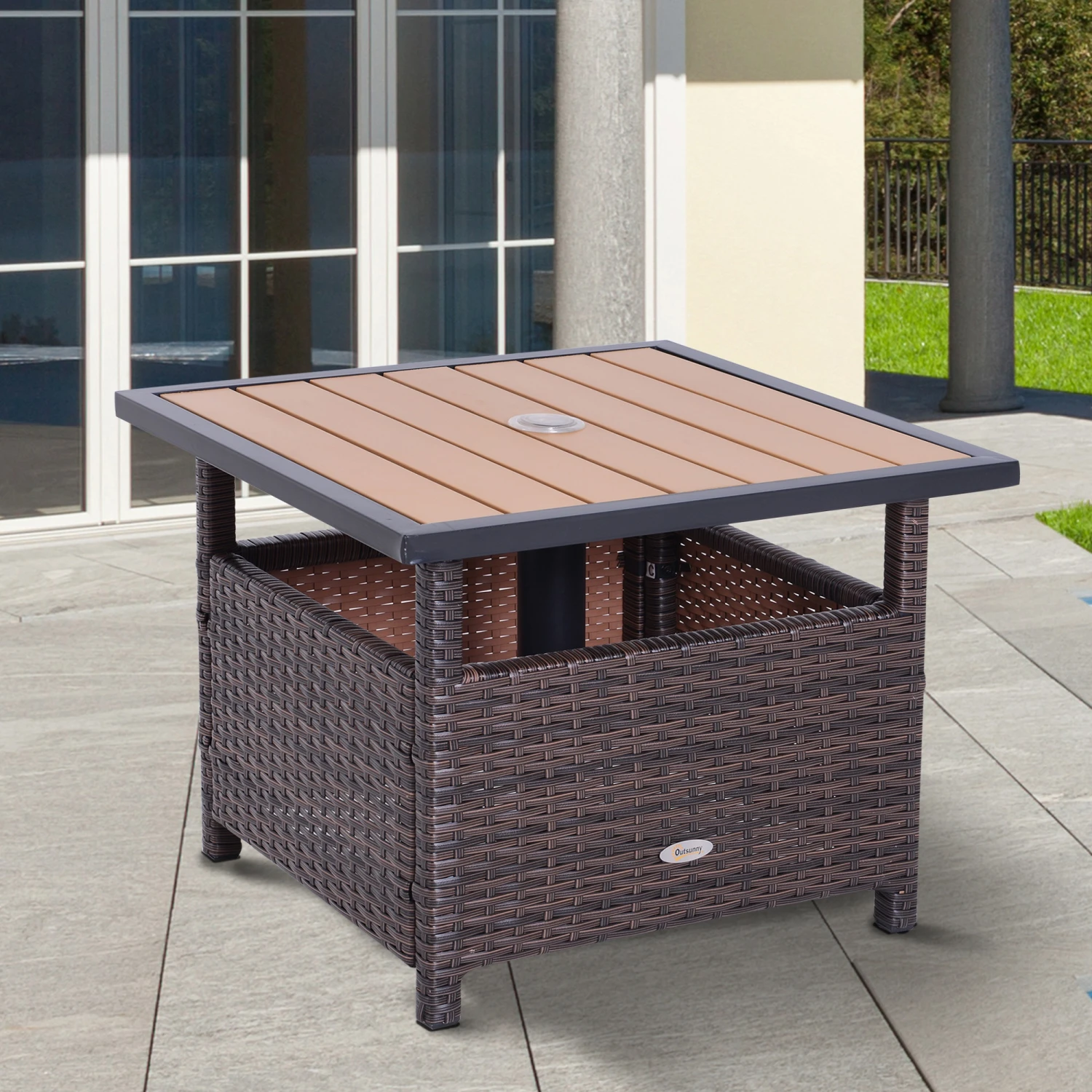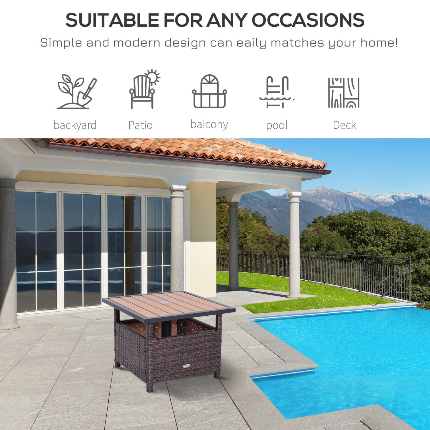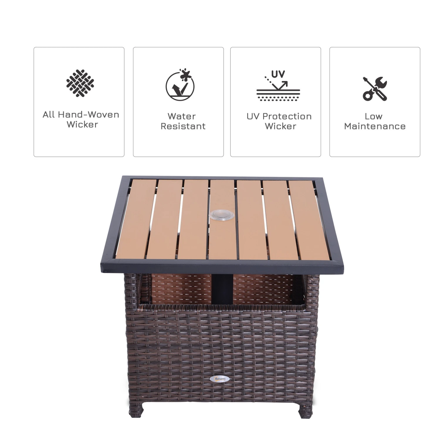 The Outsunny Rattan Wicker Outdoor Accent Table with Umbrella Insert features an elegant design and functional umbrella insert. The wood-styled polyethylene top is waterproof, stain-resistant, and easy to clean. The weave rattan basket underneath can be used for storage or filled with weights when supporting a patio umbrella through the 1.2″ diameter umbrella insert. Furthermore, you can accommodate a 1.75″ diameter umbrella when removing the insert, allowing for greater flexibility.