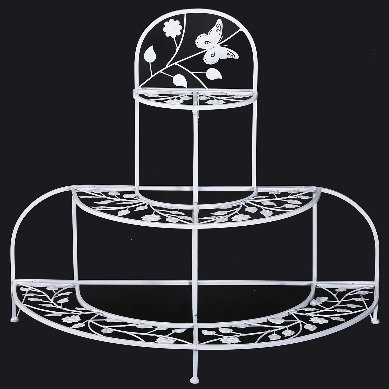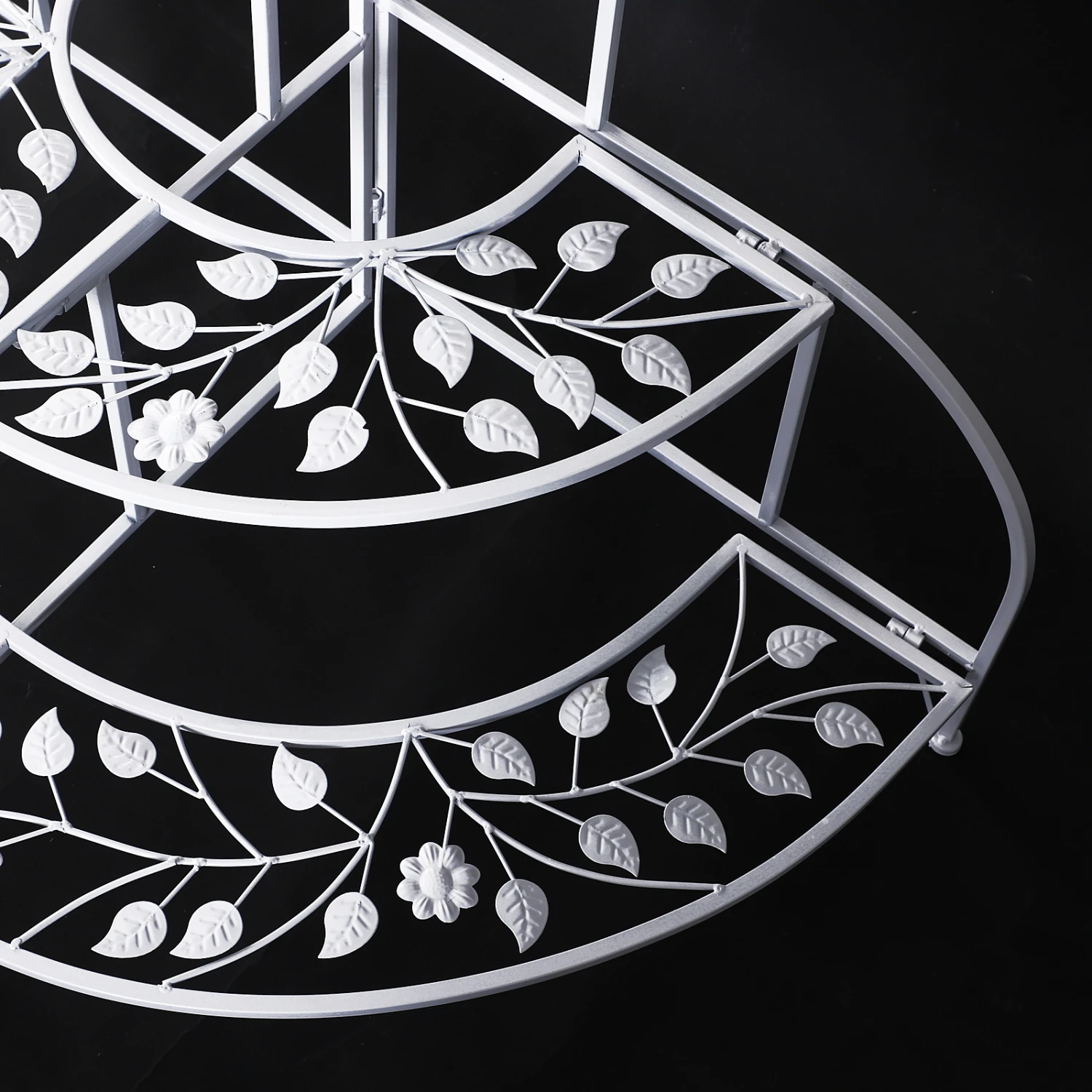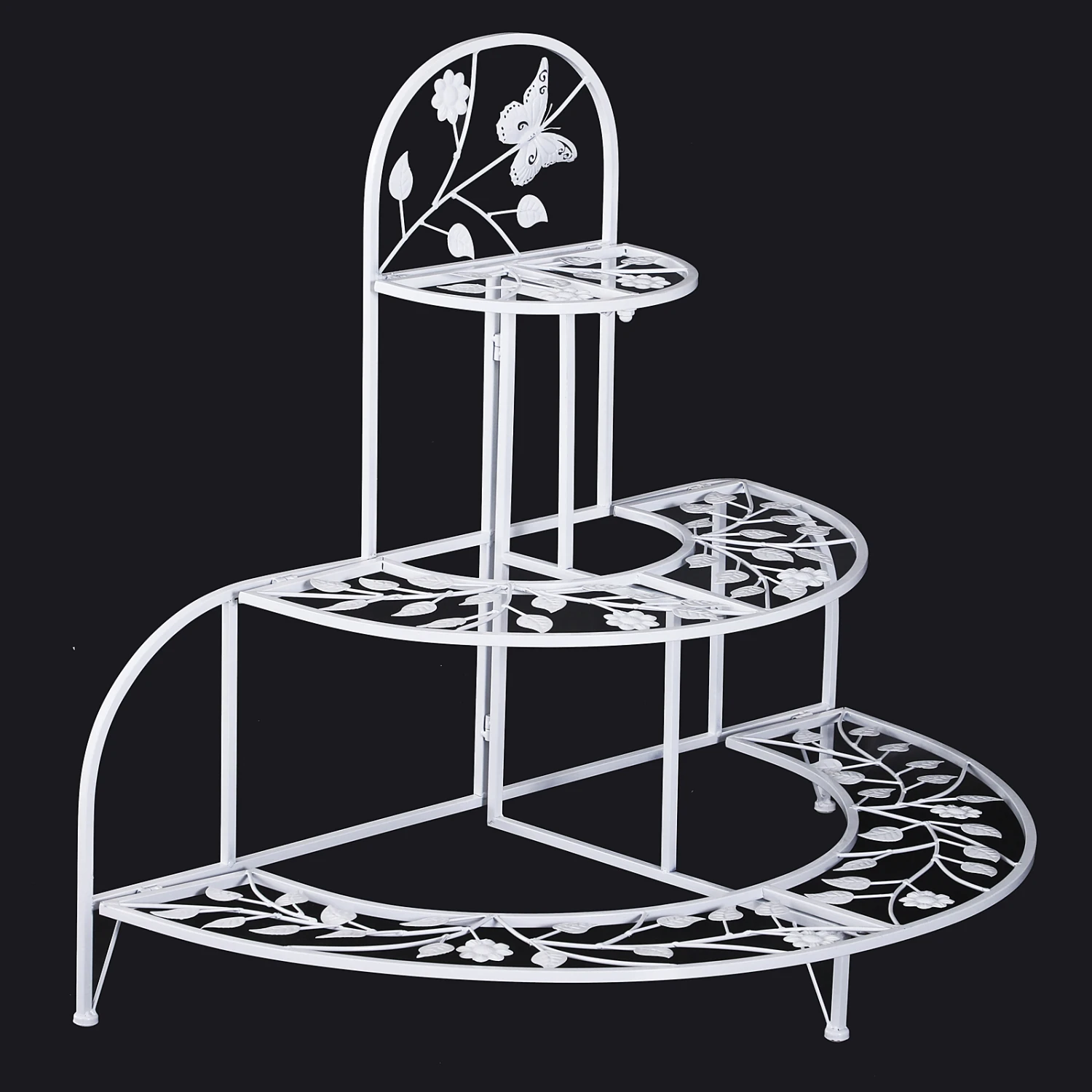 - – Stair step style metal display plant stand with a classic and elegant scrollwork design