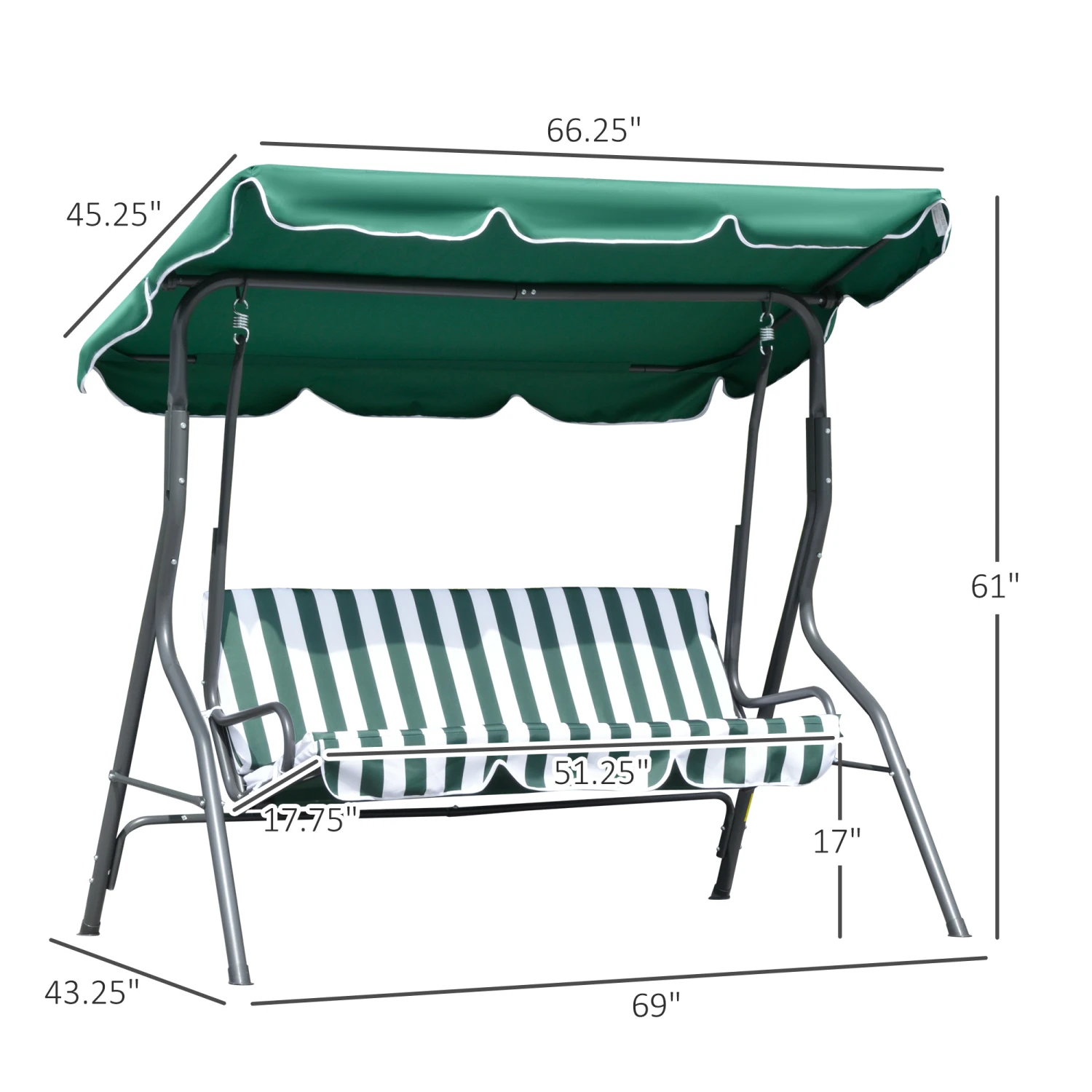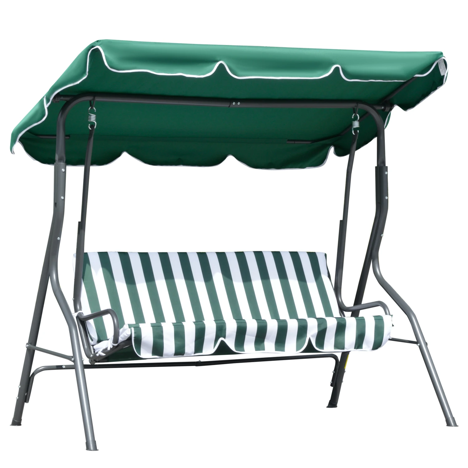 Enjoy the beautiful weather with your family or friend when you lounge in the shade on this Outsunny 3 seater outdoor swing chair. This swing bench is made of a steel frame for stability. Seats feature cushions for comfort, with an adjustable angle overhead canopy to shield you below from sun glare. Designed for comfort and style, this porch swing with canopy allows you to gently sway in the breeze to the soundtrack of lawnmowers and chirping birds.