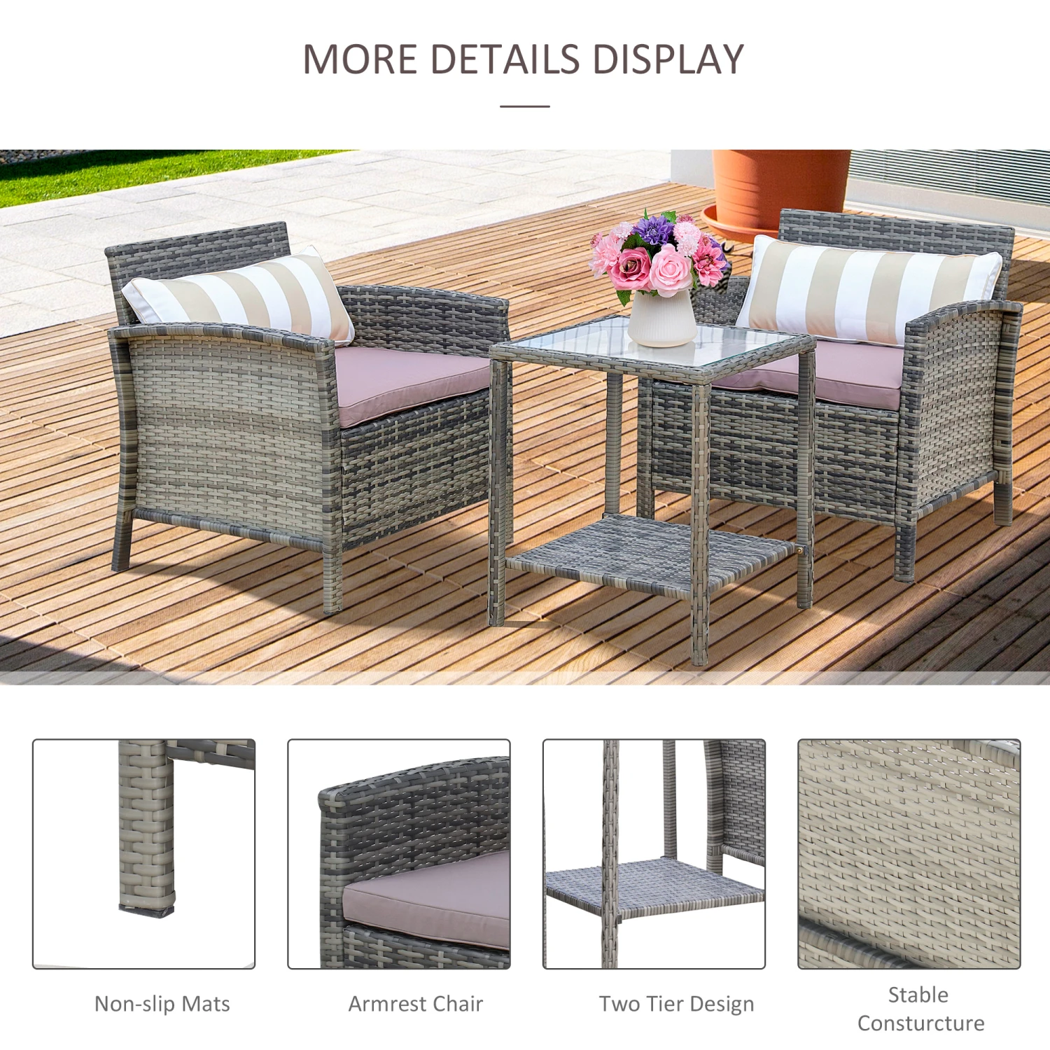 Sit back in the comfort of your garden with this three-piece wicker patio furniture set by Outsunny. Made from handwoven PE rattan, reinforced with a strong steel frame, each piece has a high weight capacity and superior water resistance. Curl up and relax away the day in the sun on our chair’s thick cushions and wide seat. Enjoy a drink on our glass patio table; it wipes clean, so there will be no crying over spilled milk. It helps you store safely outside; two tiers provide a covered shelf.