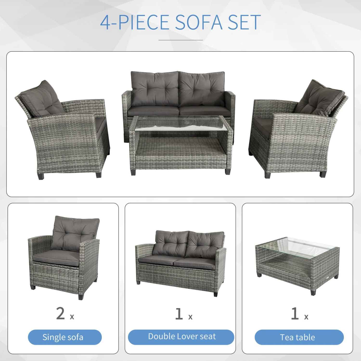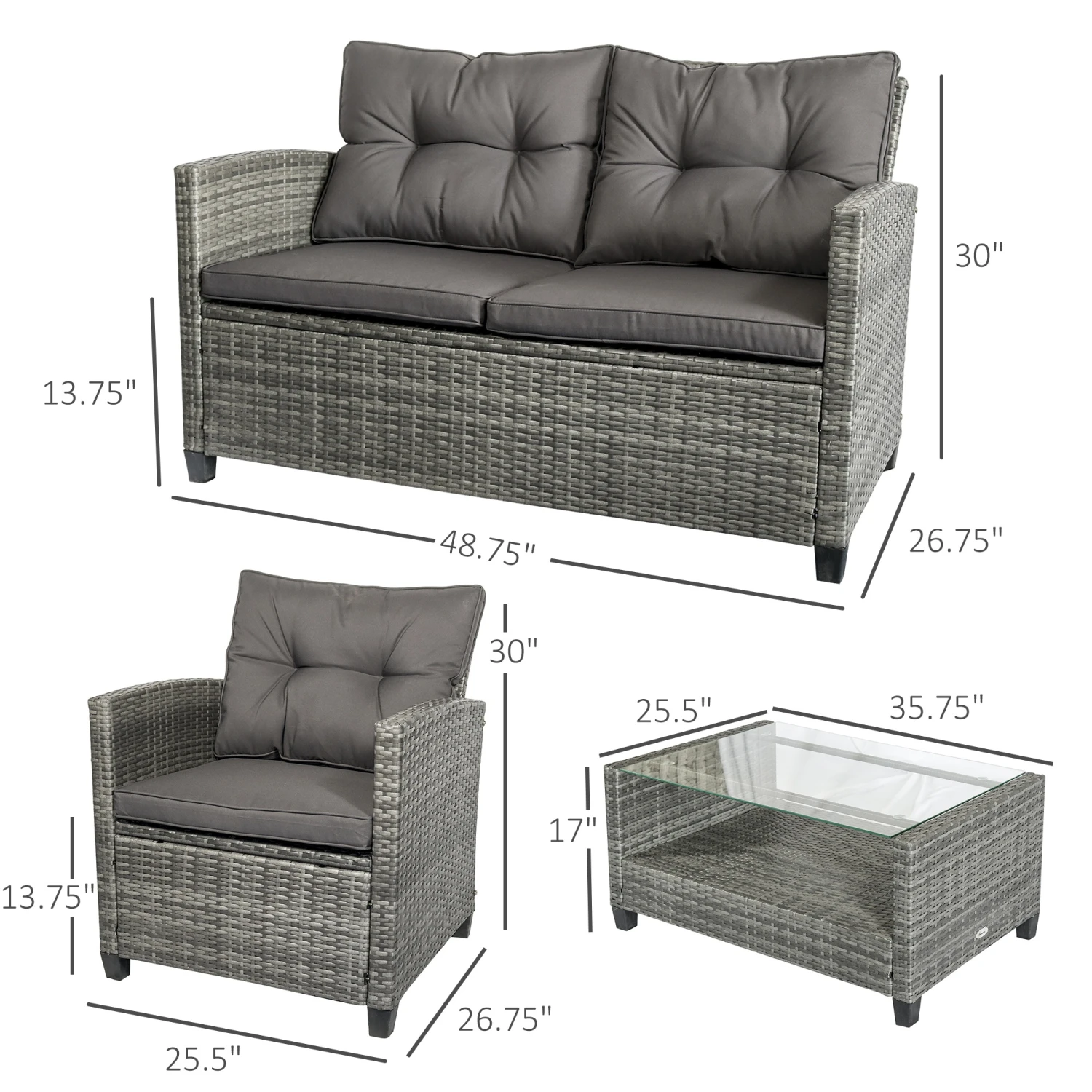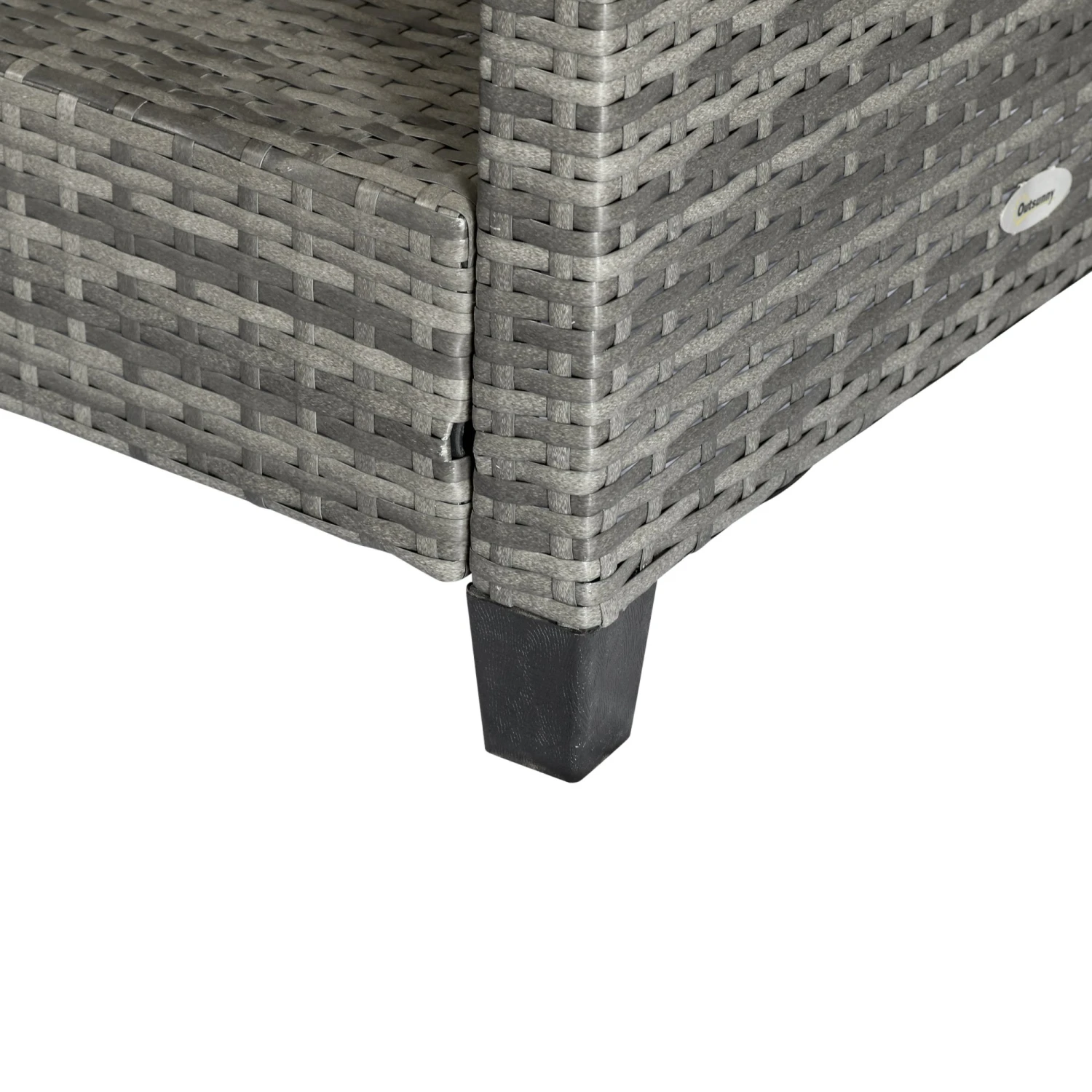 Our 4-piece wicker patio furniture set brings the comfort of the indoors to your backyard. Everything is there: a 2-seat sofa, two chairs, and a two-tier coffee table. Enjoy perks like tilted tufted backrest cushions, a place to put drinks, and soft padded seats in the great outdoors. Always have room for surprise guests and spend more time outside. Our PE wicker patio furniture was handwoven, offering a classic rattan style with all-weather resistance. Get out, get comfy, get Outsunny.