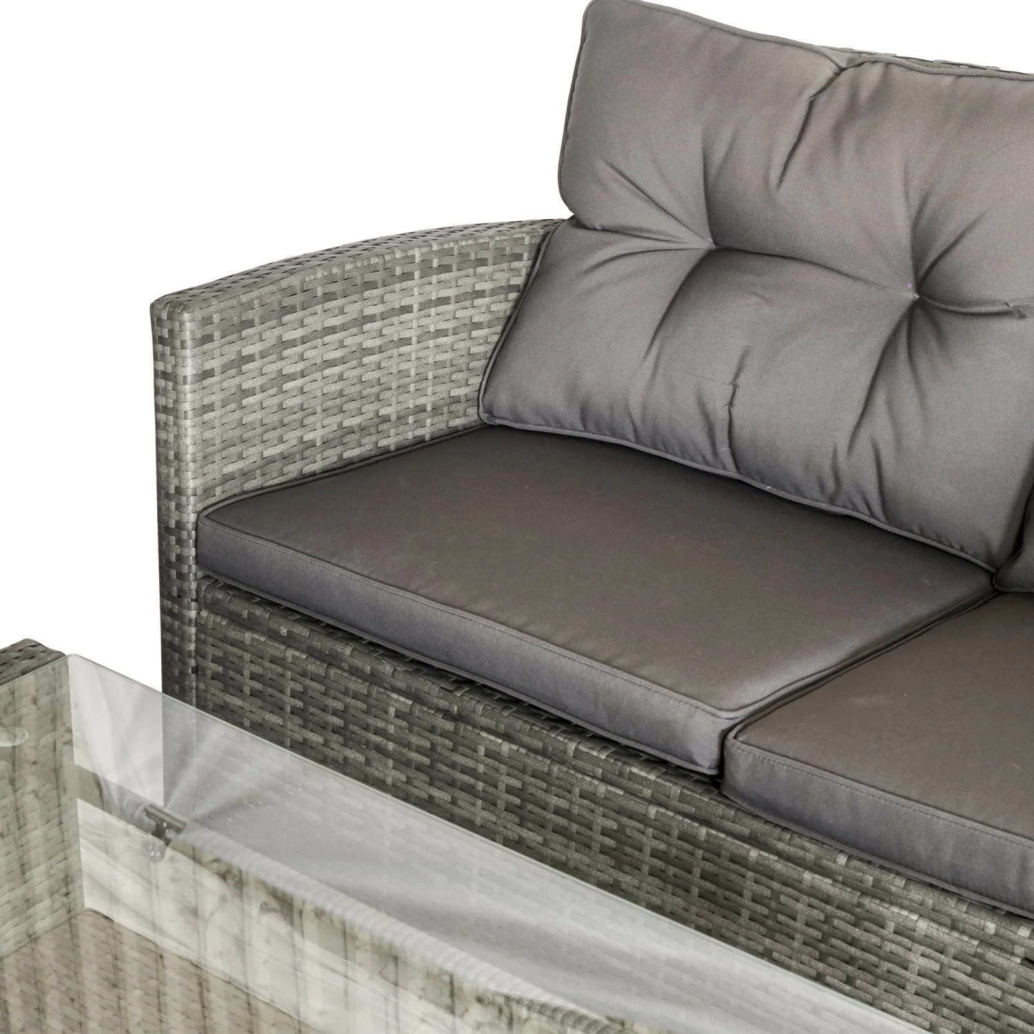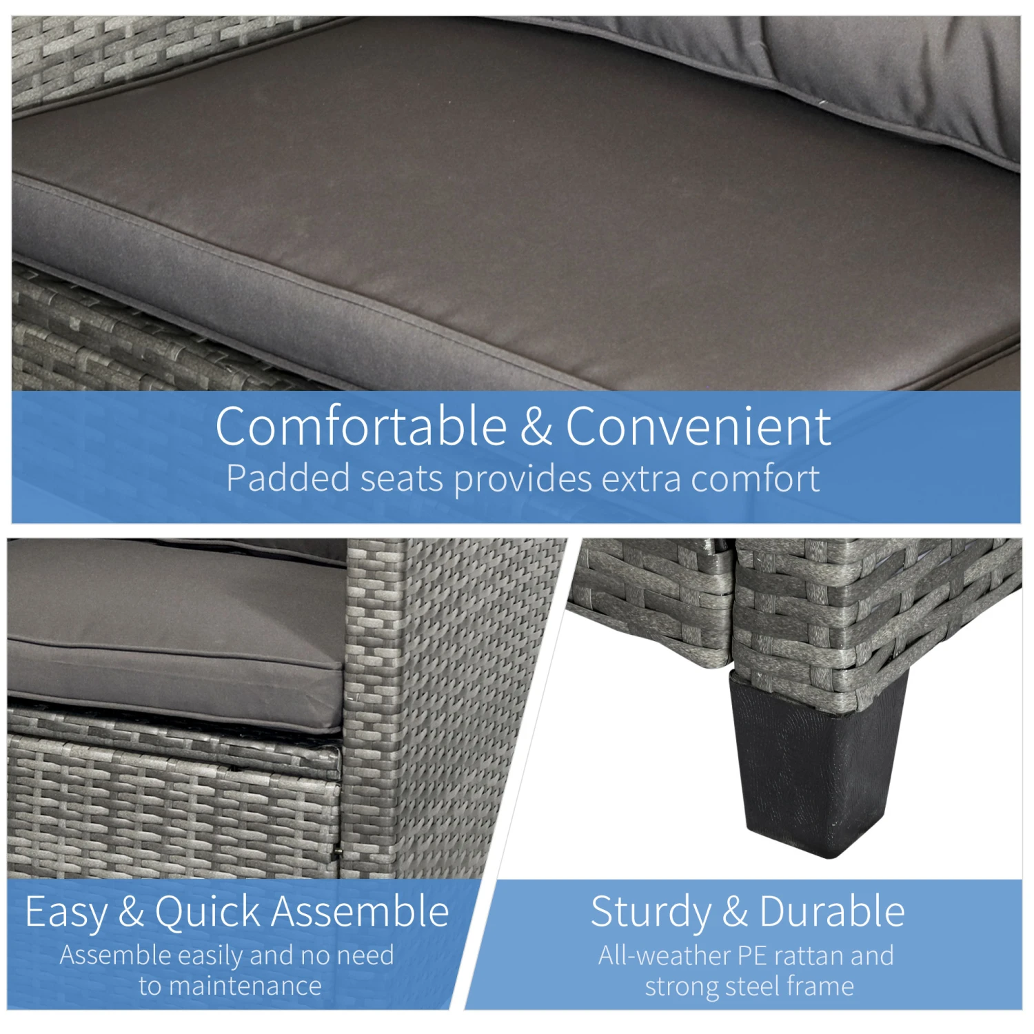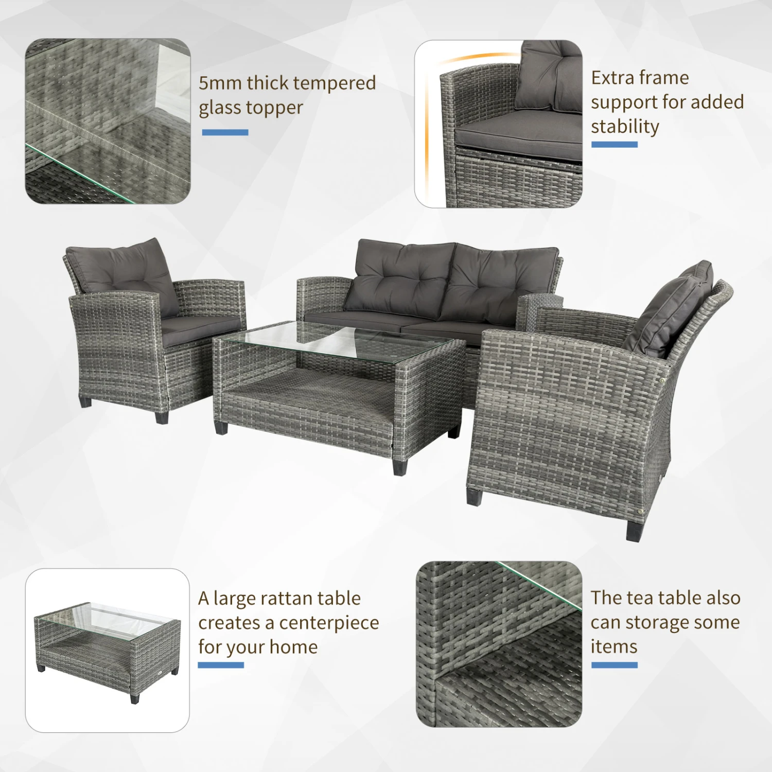 Our 4-piece wicker patio furniture set brings the comfort of the indoors to your backyard. Everything is there: a 2-seat sofa, two chairs, and a two-tier coffee table. Enjoy perks like tilted tufted backrest cushions, a place to put drinks, and soft padded seats in the great outdoors. Always have room for surprise guests and spend more time outside. Our PE wicker patio furniture was handwoven, offering a classic rattan style with all-weather resistance. Get out, get comfy, get Outsunny.