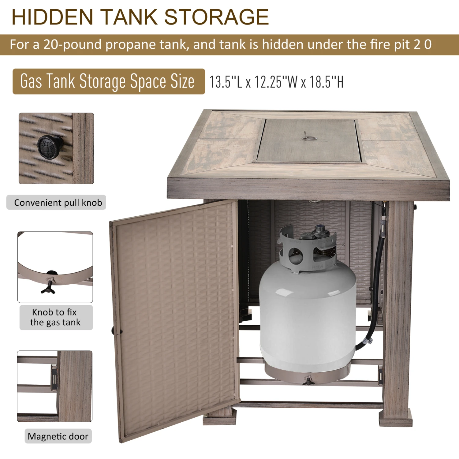 - – 20 lb. gas tank is hidden from view by a convenient door