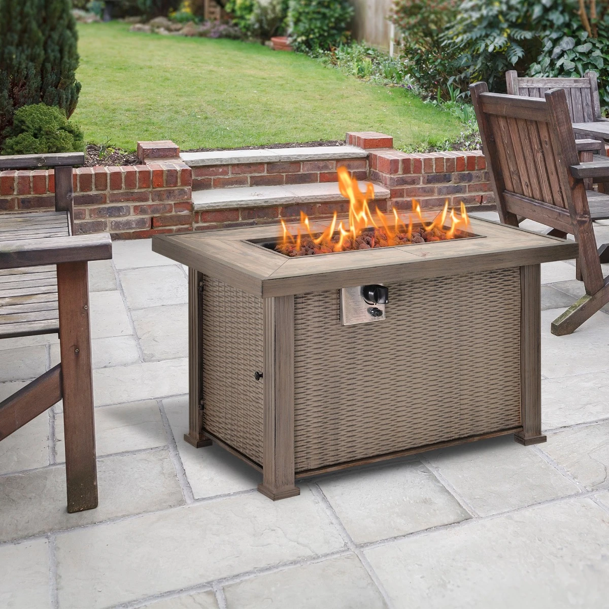 Enjoy the ultimate backyard ambiance year-round with our cozy, elegant, and functional gas firepits for outside from Outsunny. It features a classic wicker design base that cleverly conceals the propane tank inside. Outdoor fire tables have a 50,000 BTU CSA-certified burner, so you can enjoy all the pleasures of a traditional fire without worrying about messy ashes. Whether it’s on a porch, patio, or in your garden, this Outsunny outdoor gas fire pit makes a classy addition to your home.