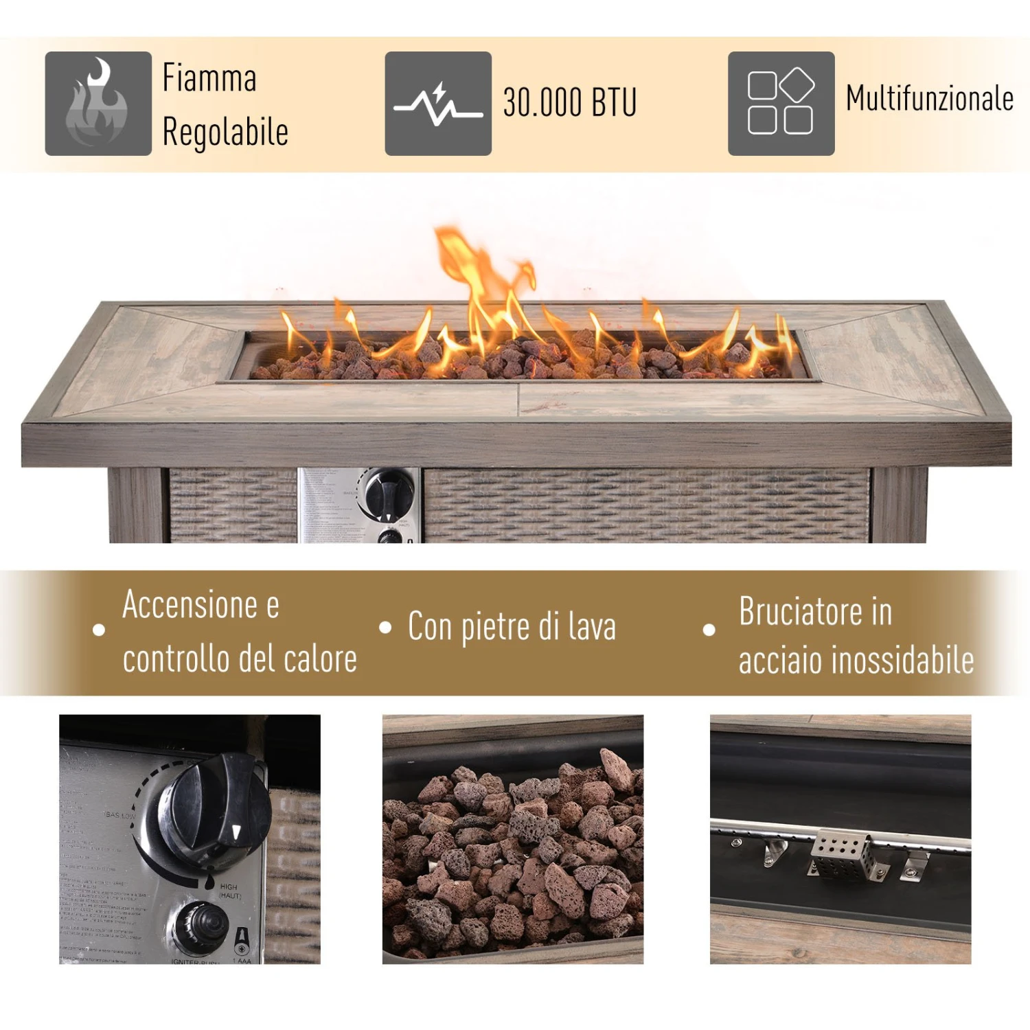 - – 2-in-1 design being both a gas firepit without the lip or a table when the fire pit is not in use