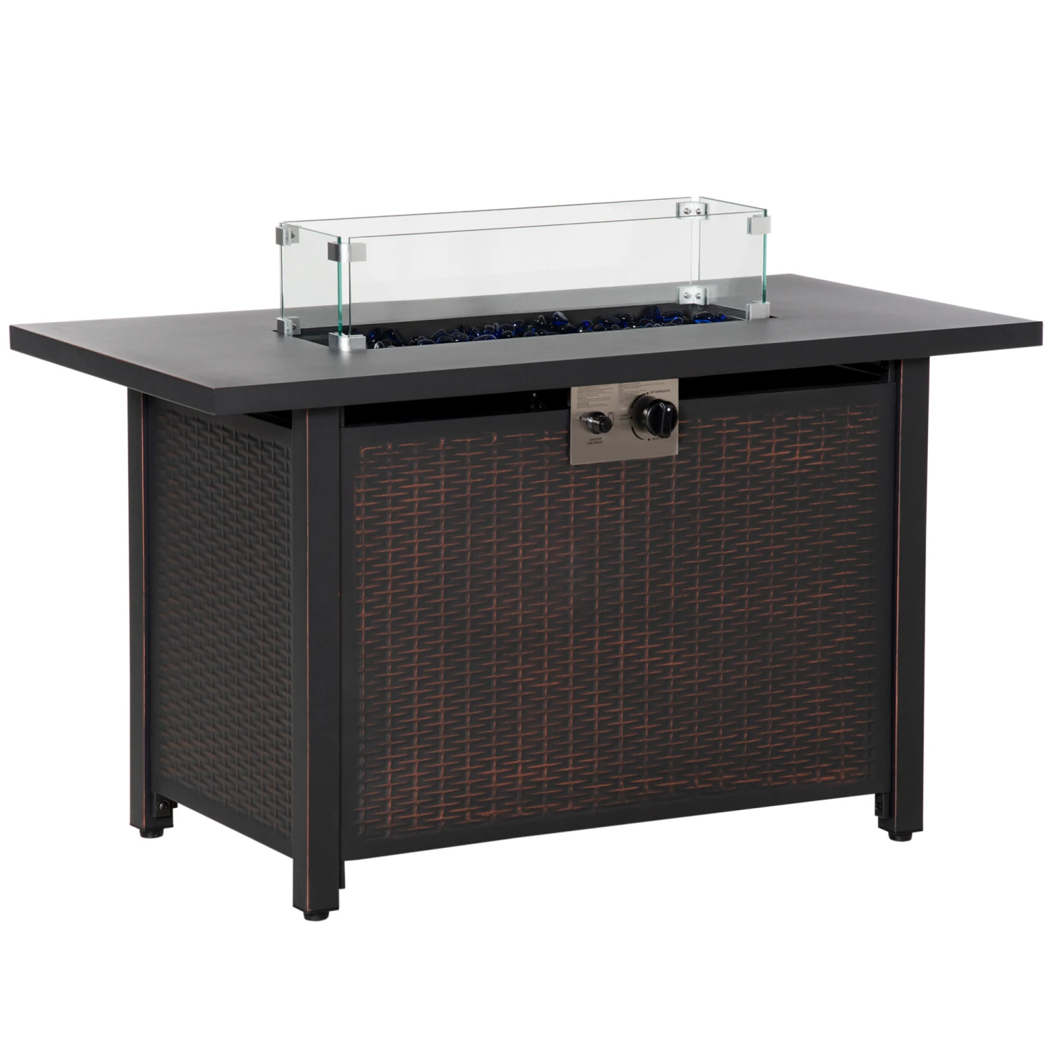 Enjoy the ultimate backyard ambiance year-round with this functional firepit table for home from Outsunny that has both a fire pit and dining table. The gas fire pit table features a classic wicker design base that cleverly conceals the propane tank inside. Complete with a 50,000 BTU CSA-certified burner, you can enjoy all the pleasures of a charming flame without worrying about messy ashes. Our propane fire table makes a classy addition to your home.