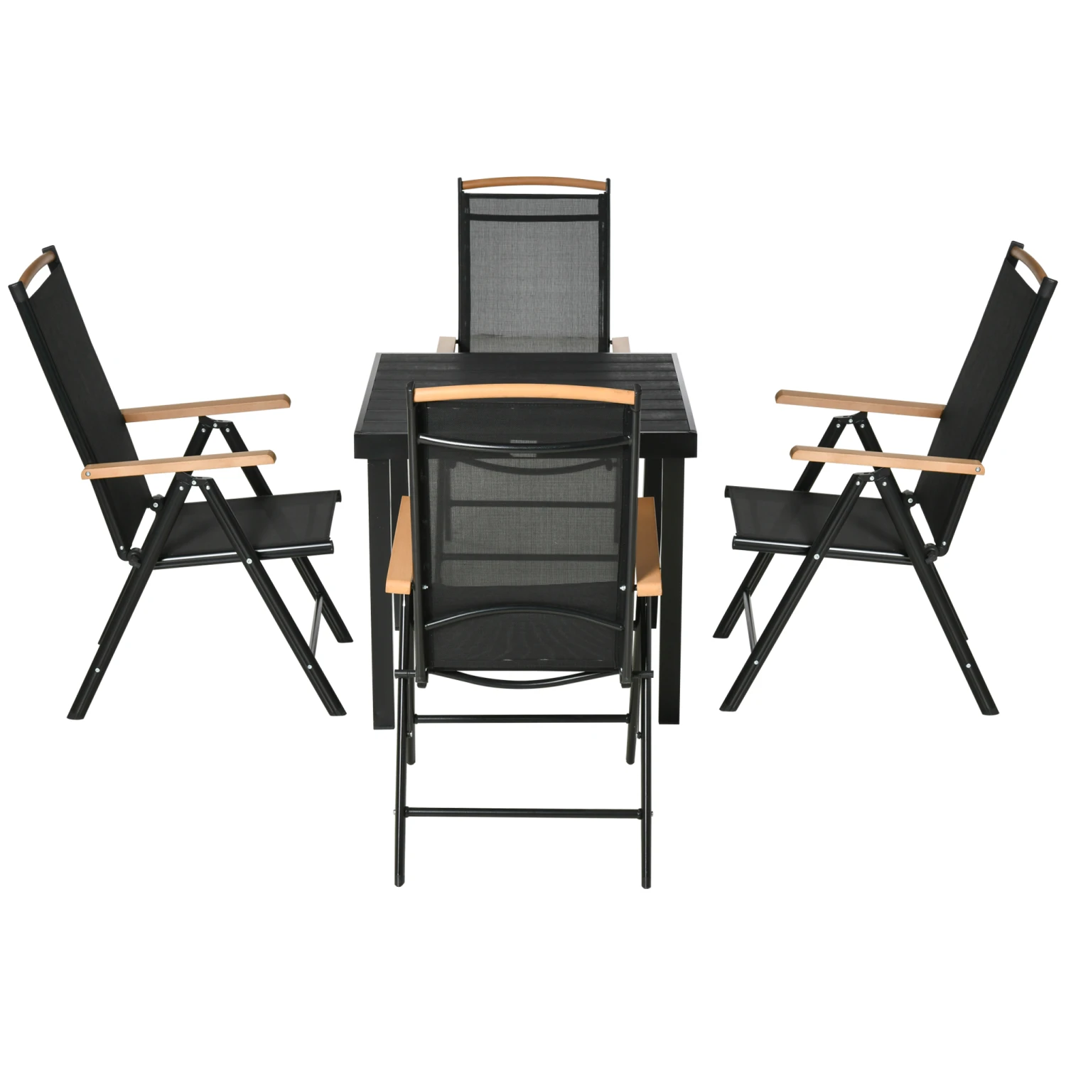 Eat dinner on the deck with Outsunny. This patio dining set for four features folding chairs that set up, tear down, and store fast. Use its table to play a board game with guests, have drinks, or dessert. Dine and recline; their backrests recline to seven angles so you can get comfortable in the great outdoors. The seats are made with breathable fabric that stays cool in the summer sun. Also, they’re supported with easy-to-carry, rain-ready aluminum frames. Get out, get comfy, get Outsunny.