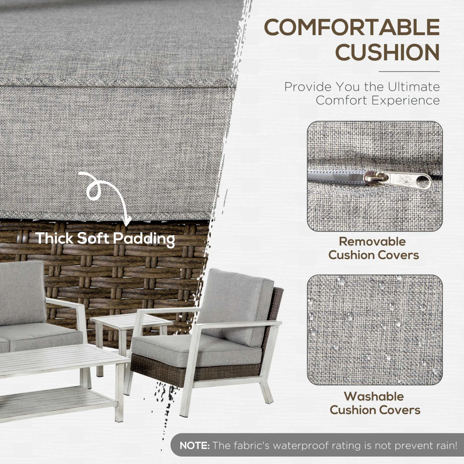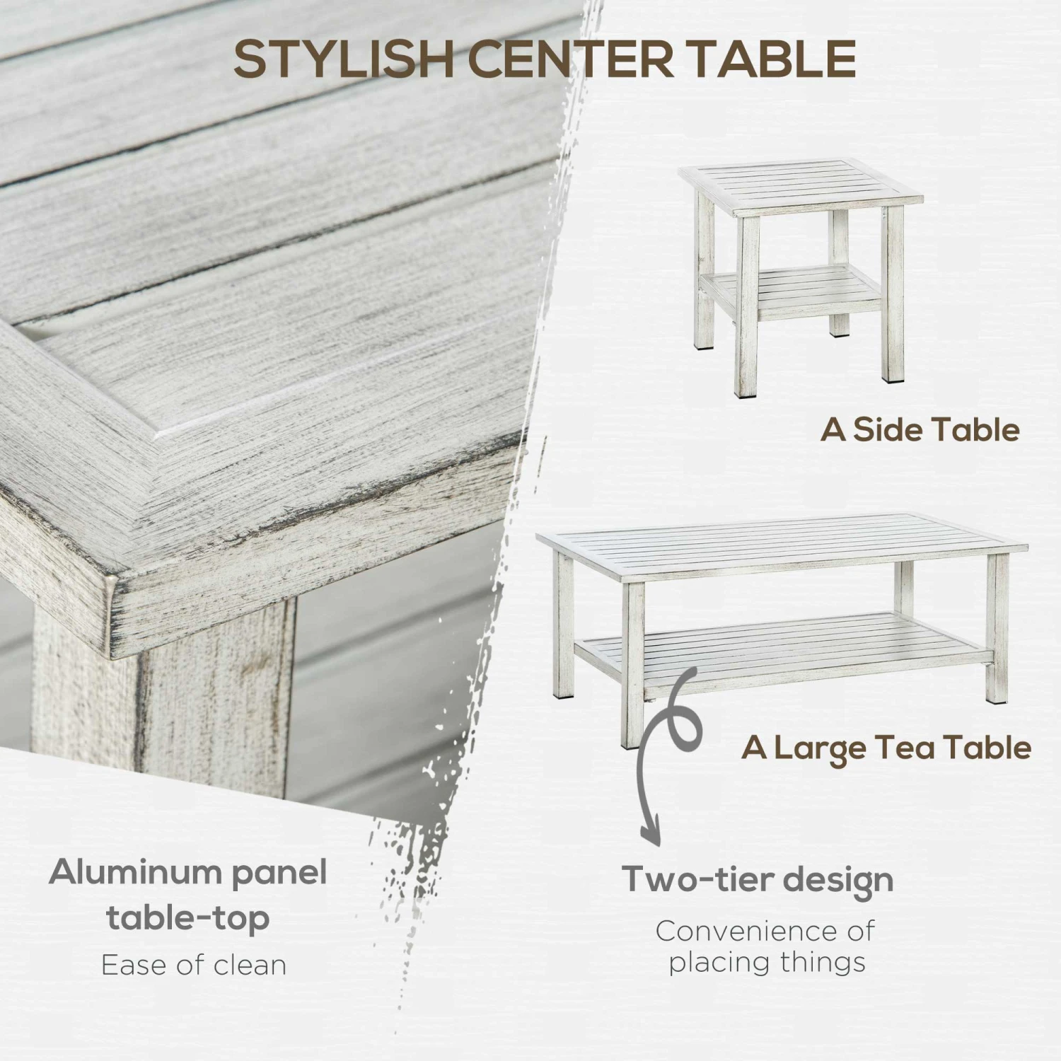 Our five-piece outdoor furniture set brings the comforts of your living room outside. Everything’s there: a loveseat sofa to share, two chairs, a coffee table, and a side table, each with two tiers and a wood-like look. Create a cozy space outside, with fully cushioned seating in a relaxed posture. An aluminum build means each piece outlasts rain, and they can be rearranged with little work. Getting more fresh air will be easy with a nice spot waiting for you. Get out, get comfy, get Outsunny.