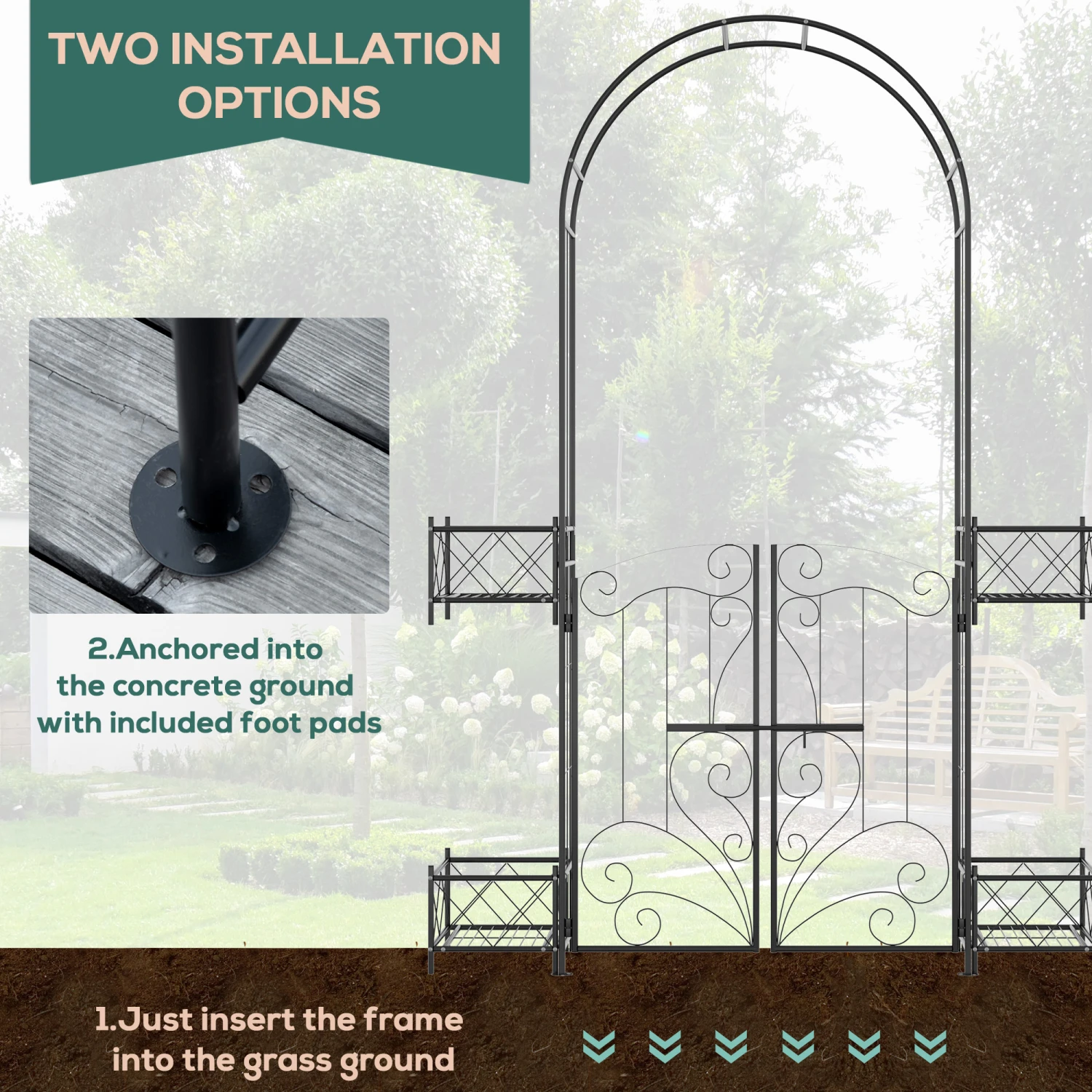 With scrollwork heart motifs Outsunny’s garden arch trellis provides an easy and attractive way to add elegance to your garden or event. A trellis to each side and planters at each end of our arch allows you to plant climbing vines inside or outside with help from liners or plant pots. An excellent entryway for weddings, decorate it with flowers, balloons, lights, or tulle. A centerpiece with form and function, use the latching double doors to provide privacy to your yard or as a part of a ceremony.