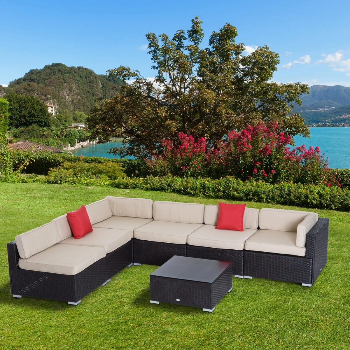 This seven-piece rattan sectional set brings the comforts of your living room to your backyard. Everything is there: two corner sofa sections, four stand-alone couch sections, and a coffee table. Enjoy the perks of home, like throw pillows and thickly padded cushions in the great outdoors. Easy to rearrange and capable of customizing to your occasion, it offers a versatile seating solution for six. Get out, get comfortable, get Outsunny.