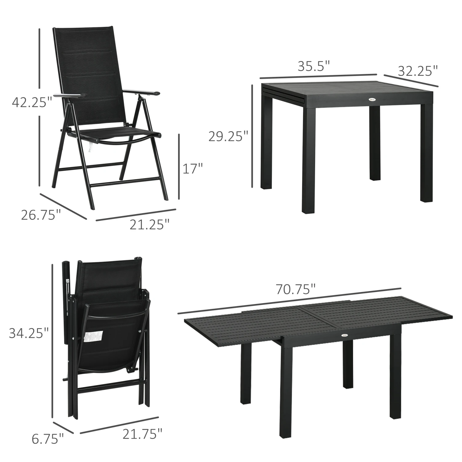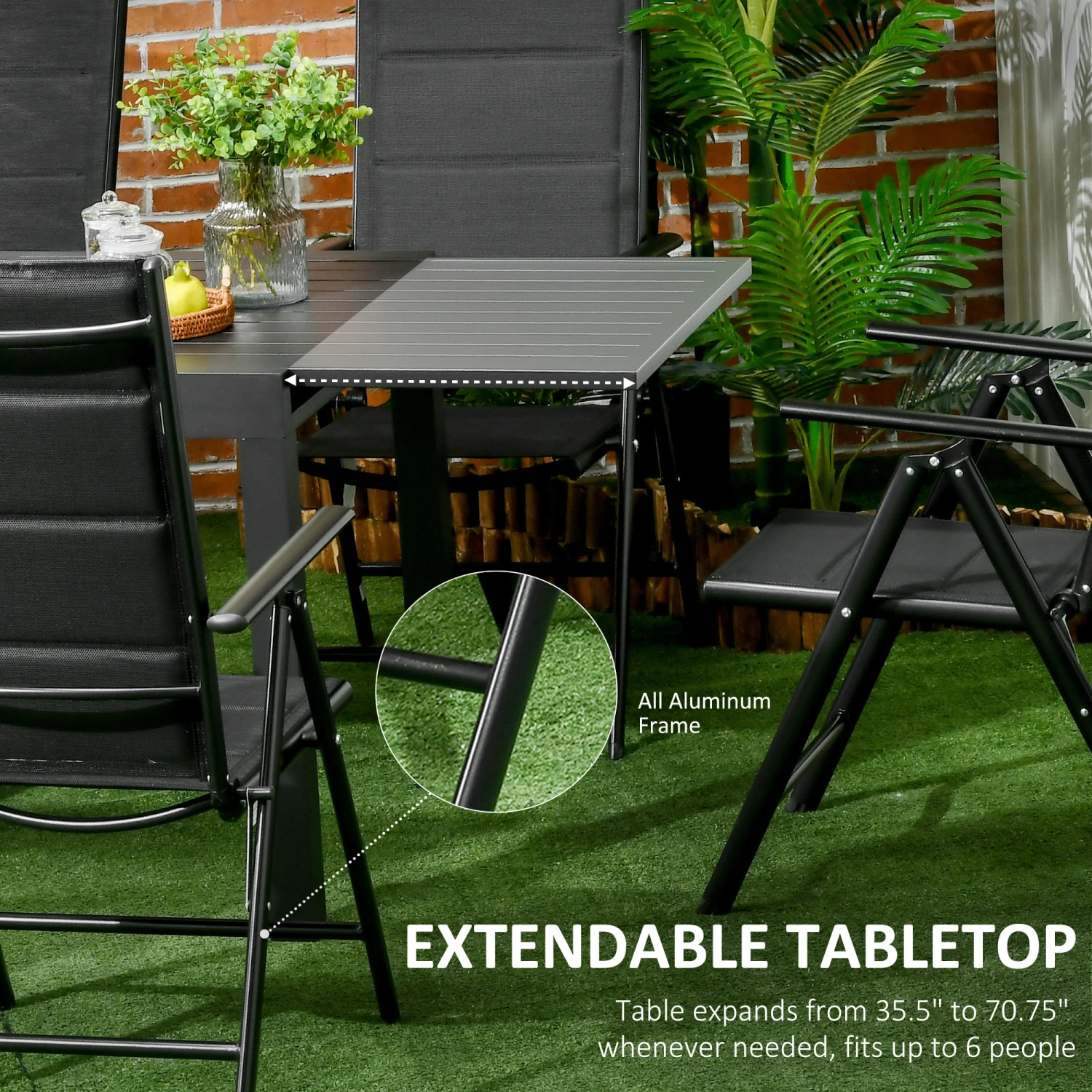 Outsunny’s patio dining set is excellent for small spaces and unexpected guests, providing ample room for impromptu picnics. With seating for six, you can enjoy quality time with friends in the outdoors. Effortlessly expand the table and unfold extra chairs when more seating is required. Relax in comfort on the cool mesh seats. Lightweight aluminum frames make the set easy to move and care for. From setup to relaxation, our dining set ensures a stress-free experience for your outdoor gatherings.
