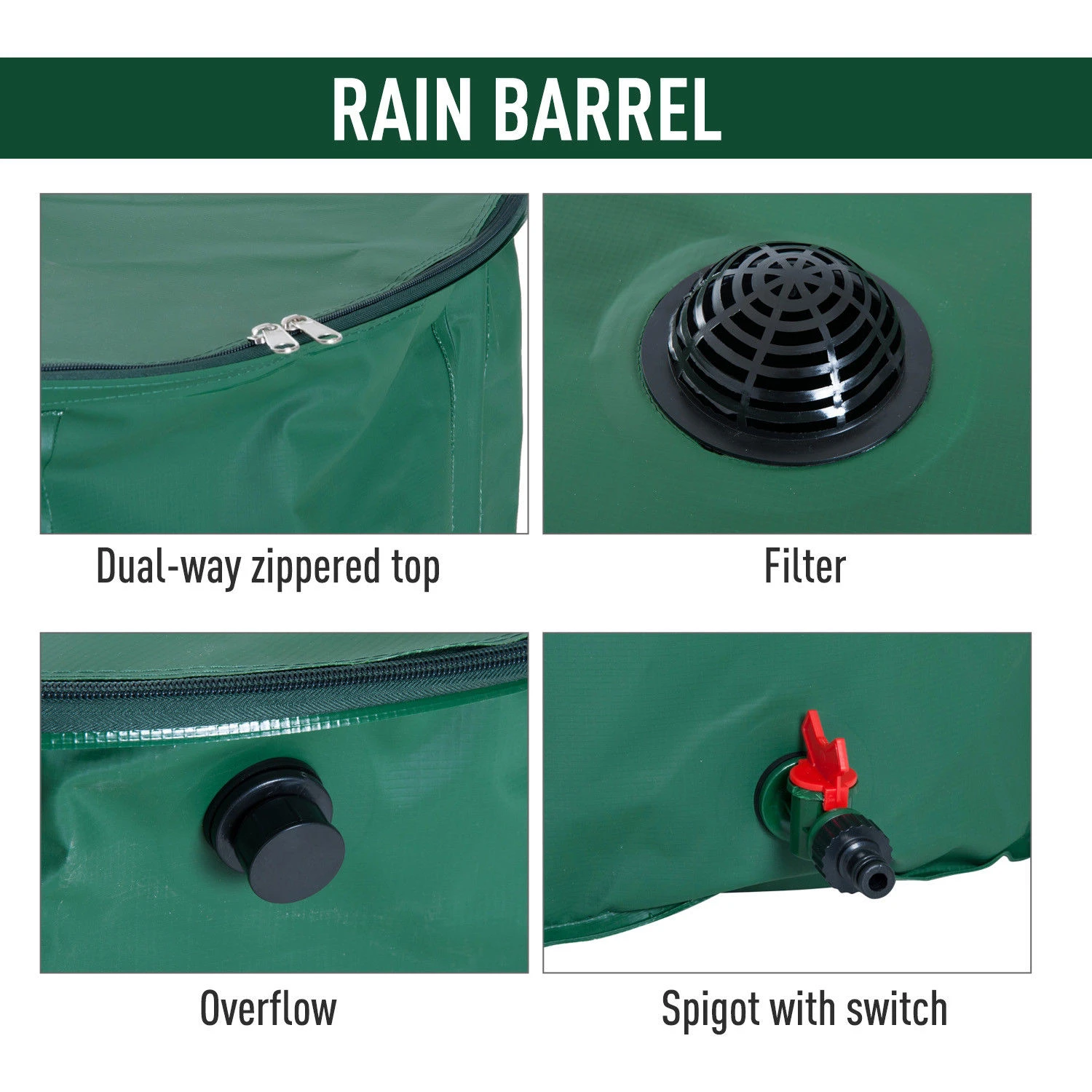 The Outsunny 80 Gallon Rain Harvesting System with Water Catchment Tank is an efficient way to collect fresh rainwater and reduce your water bill. Made from durable PVC material this catchment container is weather resistant and made for long-lasting use. Two-way zippers on the top make it simple to open and close while keeping insects out. This rain catchment system has six heavy-duty legs that function as strong support to the barrel. The rain barrel has an overflow tap that can be used to connect other barrels for maximum storage capacity. Effortlessly collapse and store the compact water catchment system for easy storage in your garage or shed when not in use or during the offseason. This Outsunny rain catchment container is a necessity for your outdoor garden or lawn!