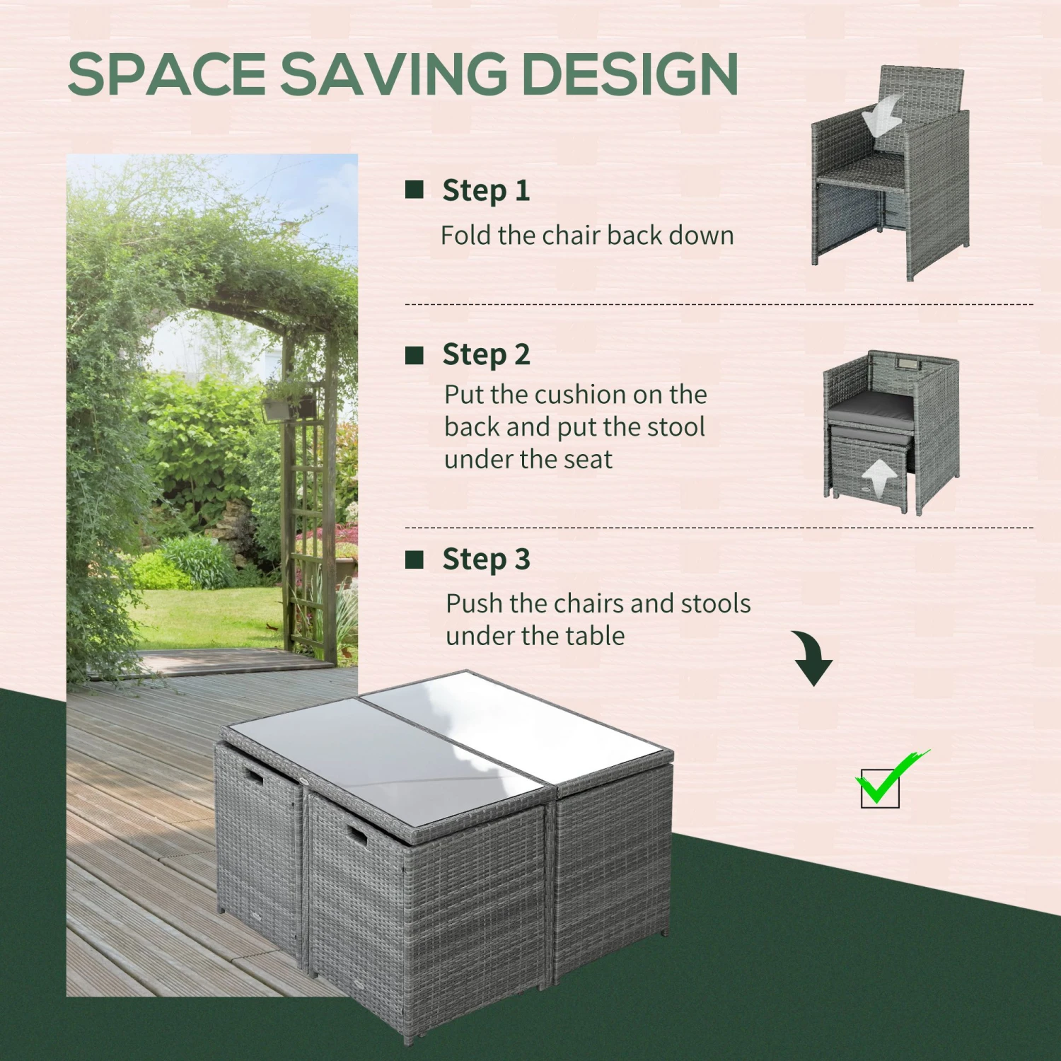 - – Material: PE Wicker, Steel, Polyester Fabric, Tempered Glass
