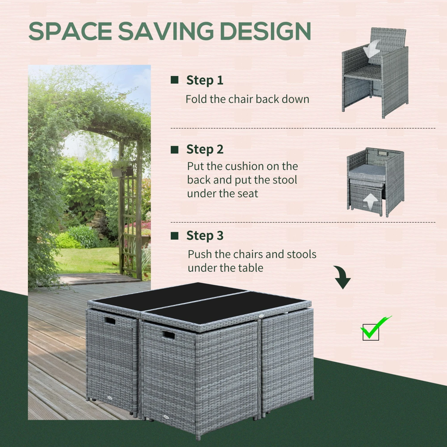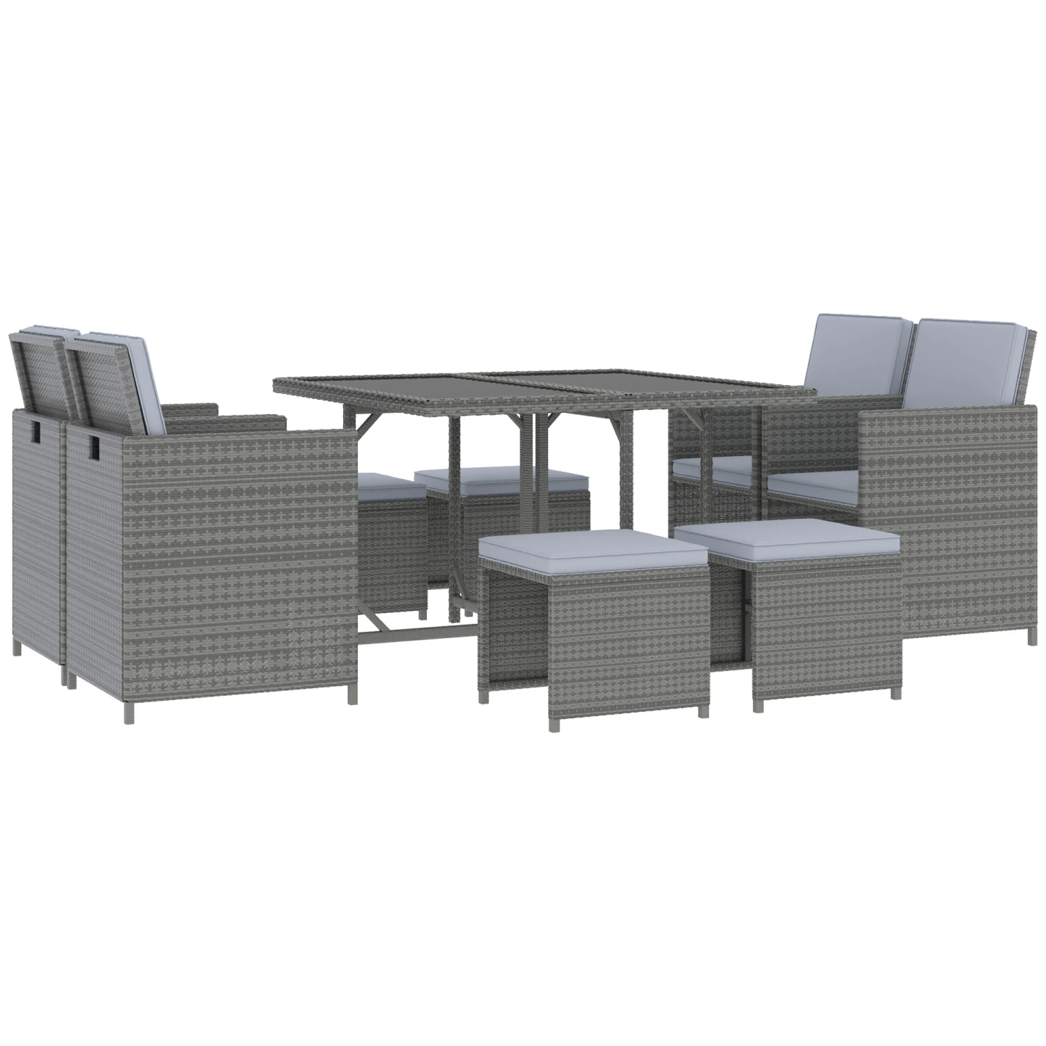 Create a picture perfect patio with our 9 pc Rattan Nesting Dining set. Built for both style and resilience, a rust-resistant steel frame adds support while PE coated rattan adds a stylish facade that is heat and weather resistant. The ottomans and chairs nest conveniently under the table to create a compact storage unit. A tempered glass tabletop creates a unique surface that is both stylish and easy to clean.