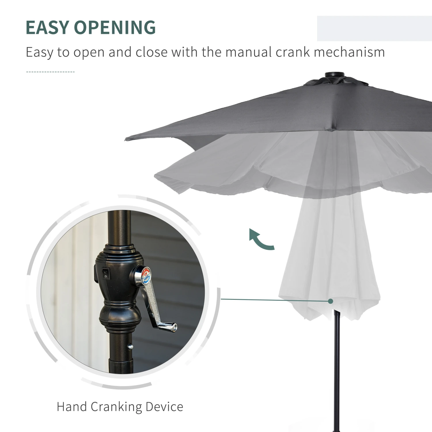 - – Rotate the crank to open and close the umbrella in a few seconds