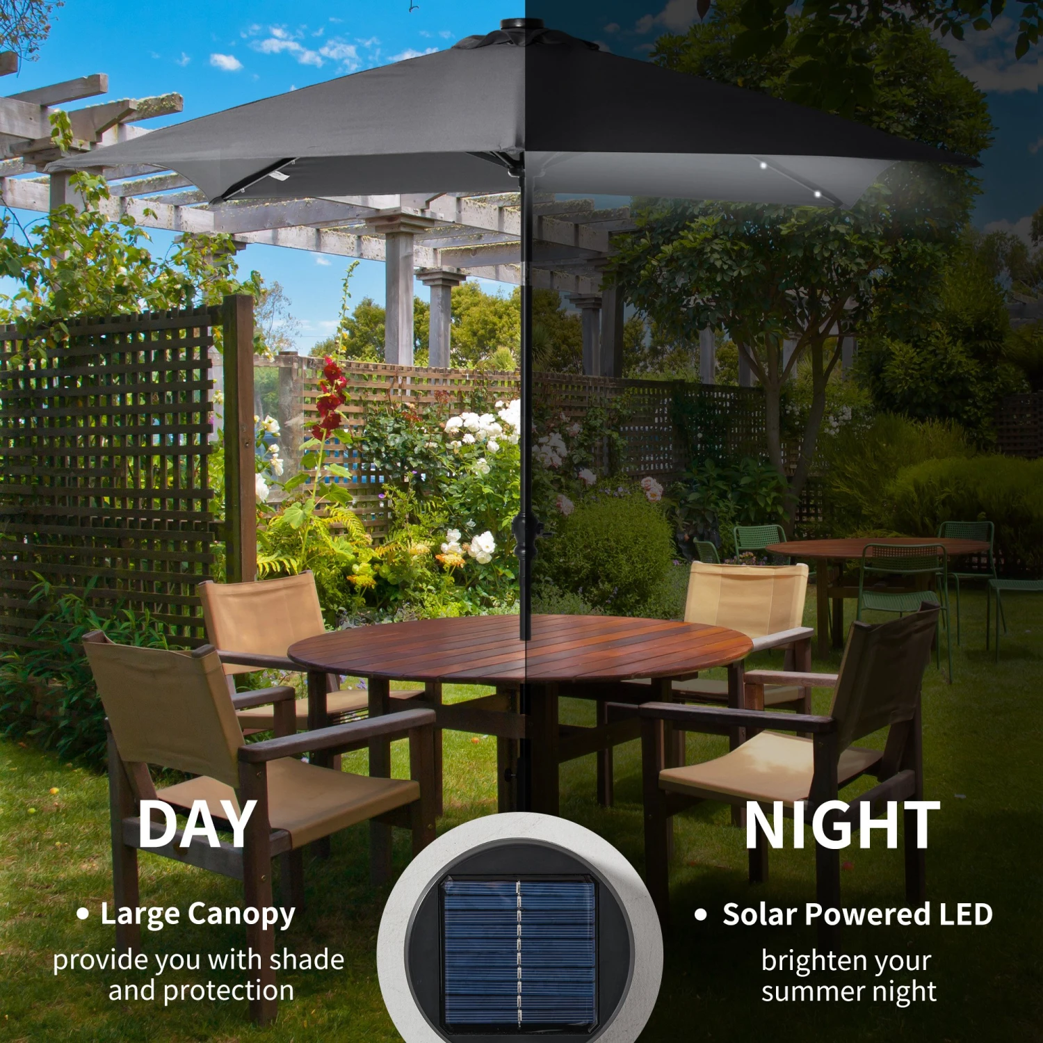 Do you need a modern and functional outdoor patio umbrella in your garden, patio or terrace? Outsunny’s patio umbrella led for patio stands out for its adjustable angle and its easy opening. You can use this patio umbrella with solar lights on a table or simply on the base. With classic style, this deck umbrella is designed to give you the shade. Equipped with solar panel and LED lights, the patio solar umbrella can provide you a bright outdoor night. Just take this parasol and enjoy your outdoor time.
