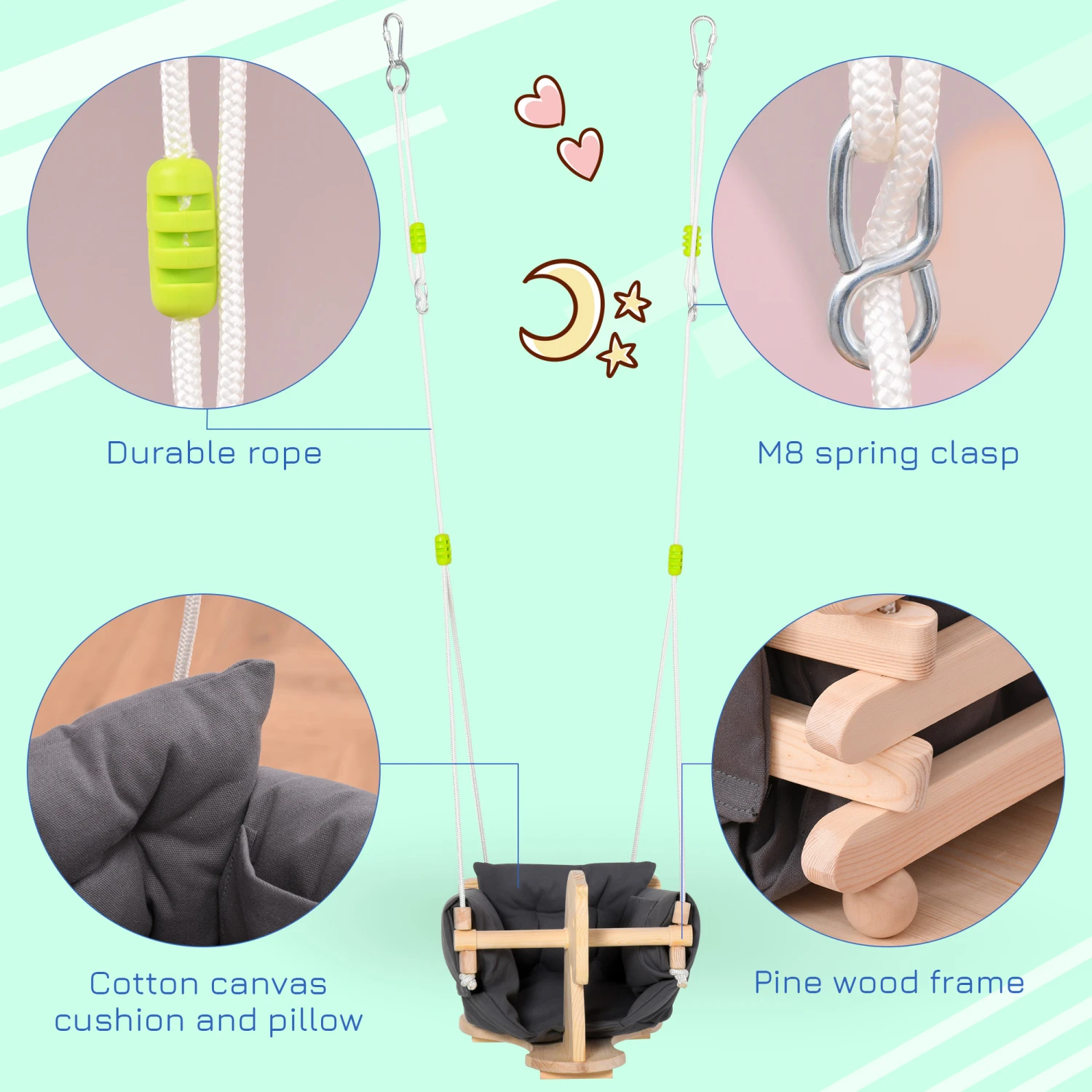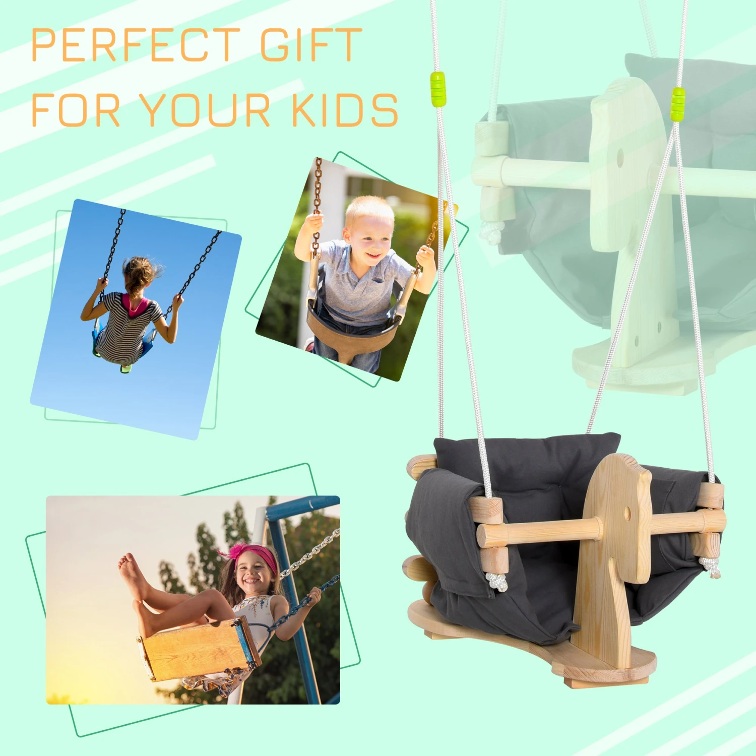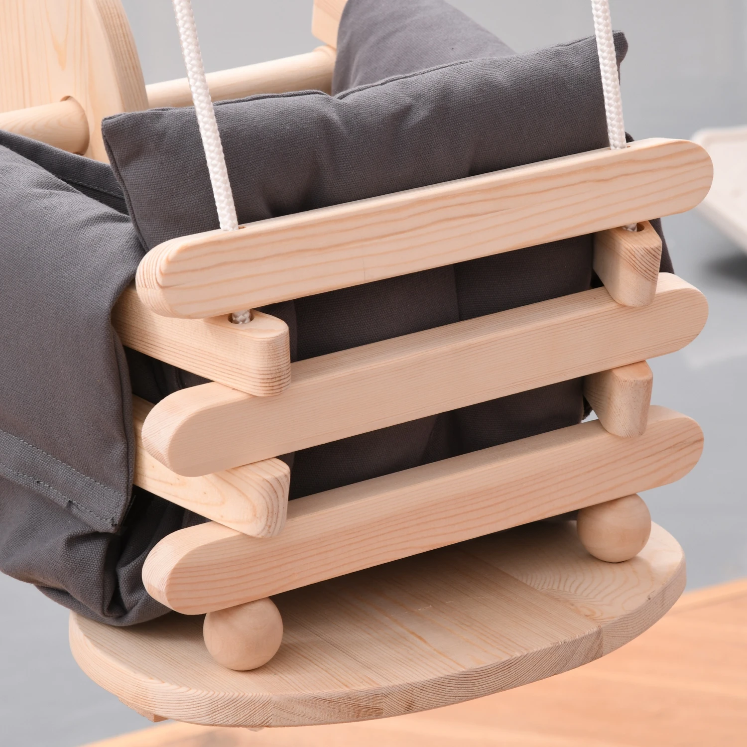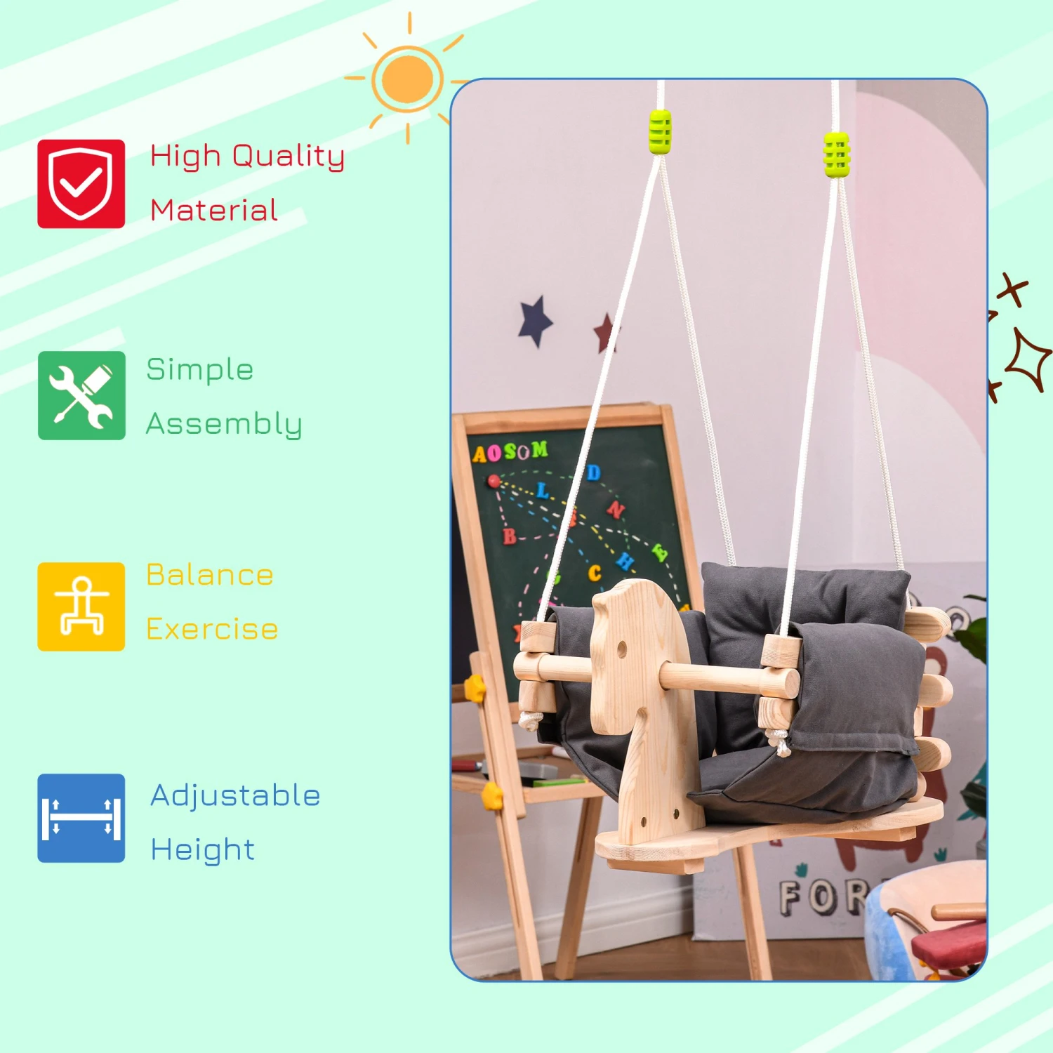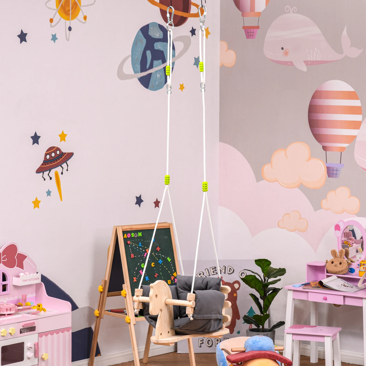 Outsunny lovely toy horse wooden swing for baby will be your ideal gift, this indoor baby swing is easy to install and suitable for indoor and outdoor use. 100% cotton cushion for comfortable backing and sitting. The solid pine wood edge ensures safe swinging. This swing seat is a perfect choice for exercise the sense of balance and physical coordination, an amazing gift for baby’s birthday, new year and Christmas.