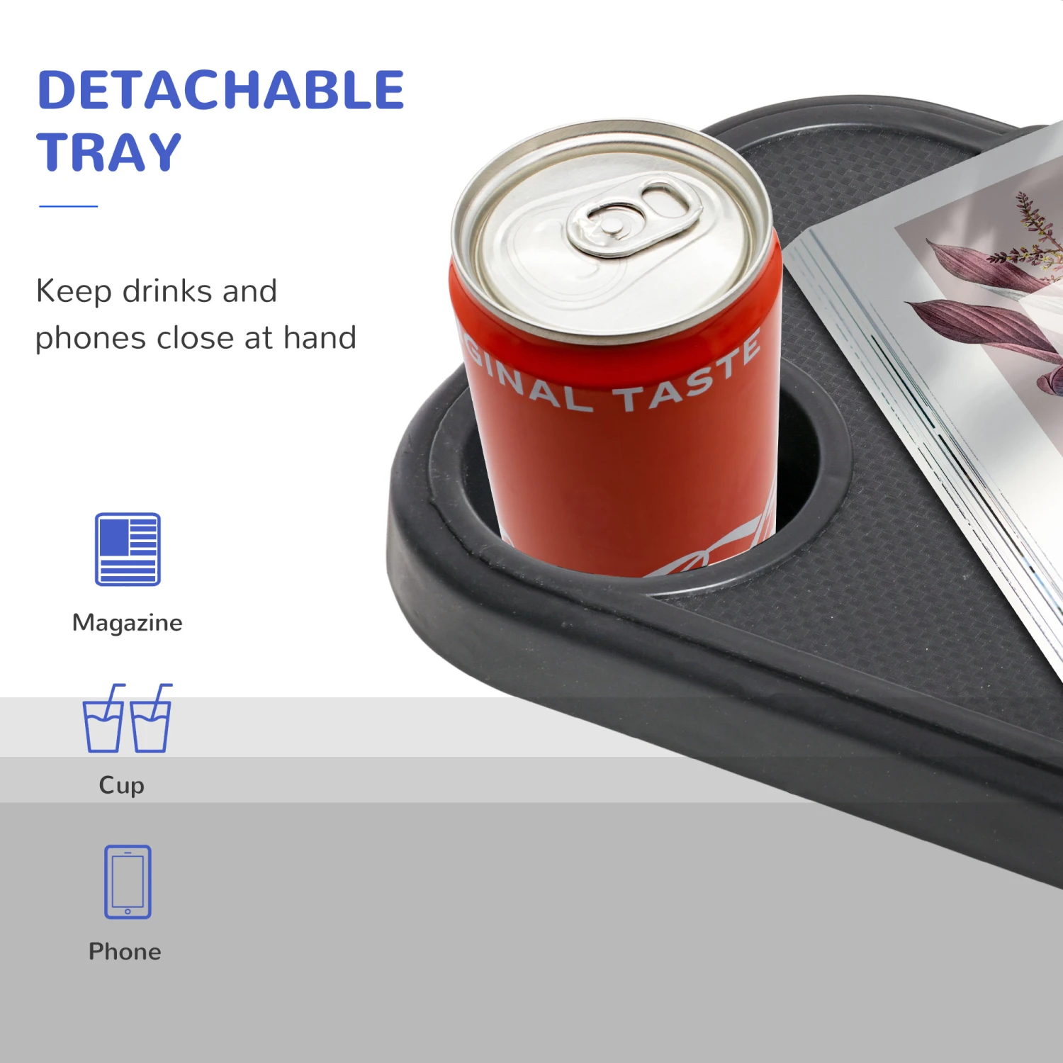 - – Cup holders and tray for drinks and belongings