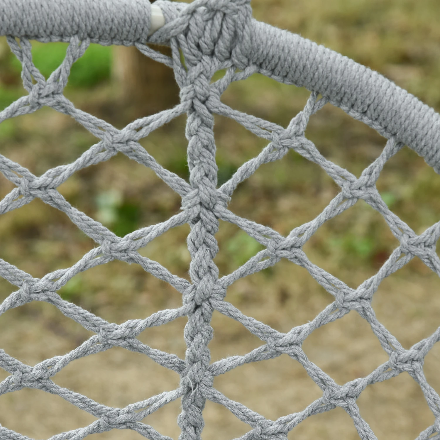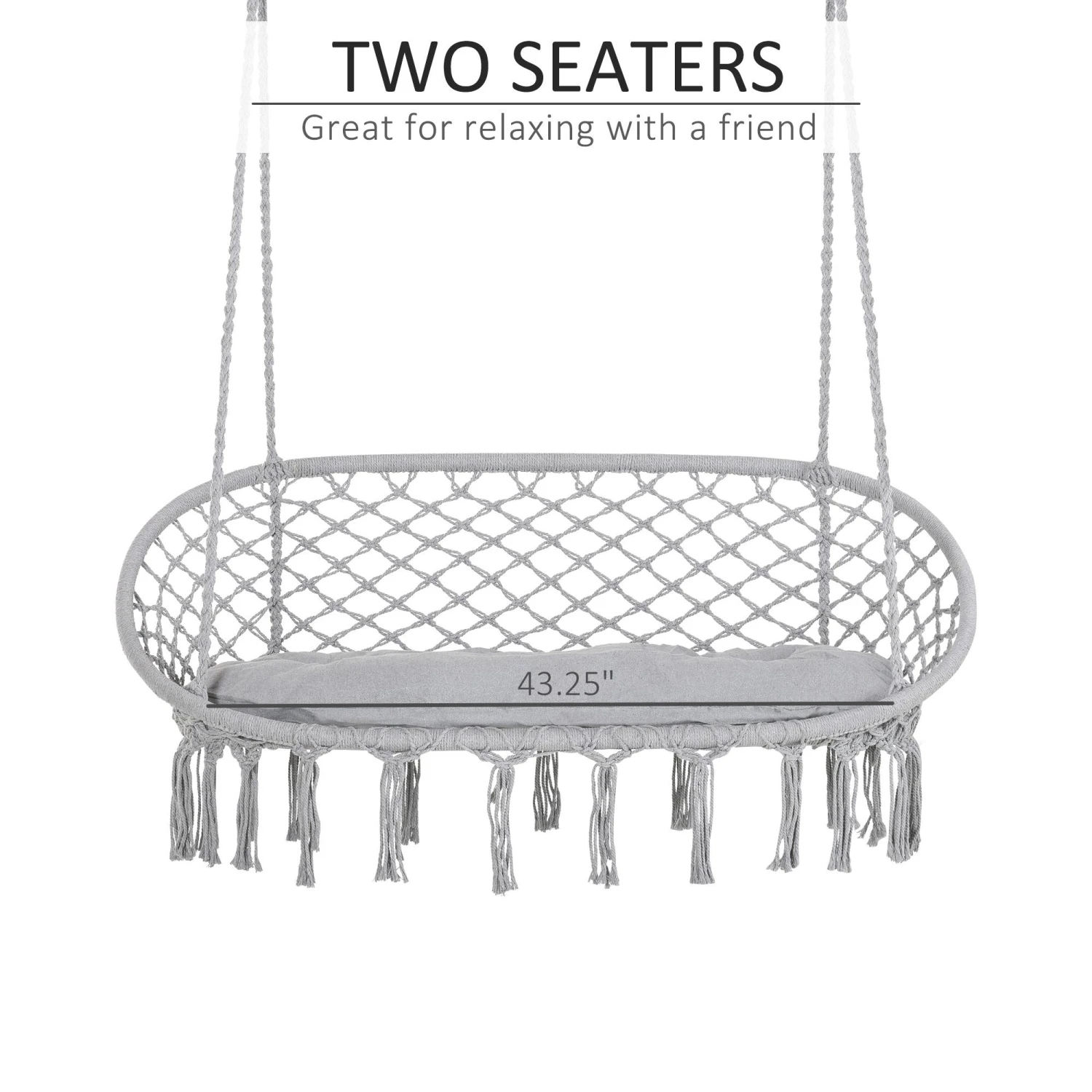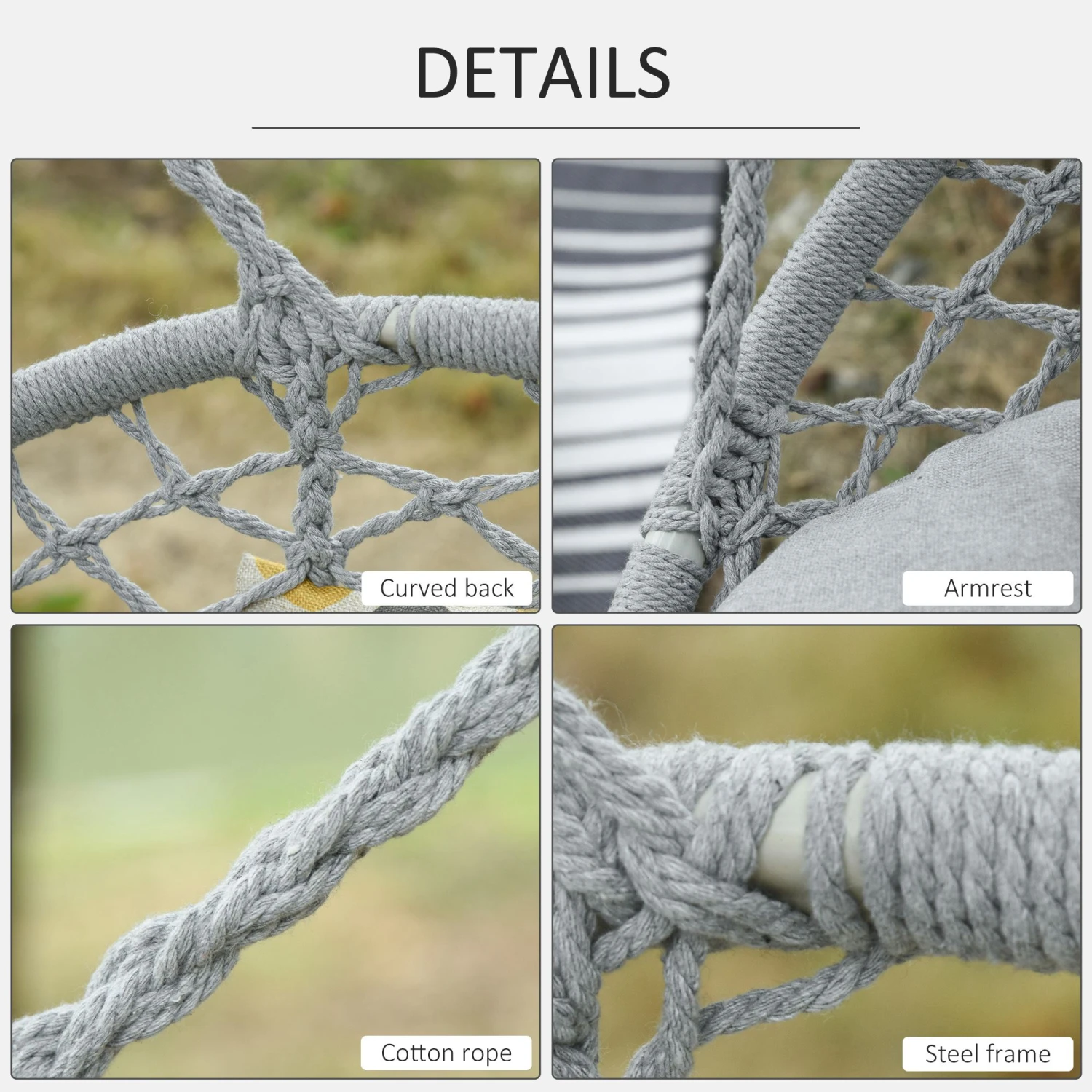 Infuse elegance into your indoor and outdoor spaces effortlessly with this hanging rope hammock chair from Outsunny. Boho style chair is crafted into a spacious two-seater design, where netting cotton rope forms the seat and back, and with fringe tassels for an attractive and unique looking. Made from metal for strength and reliability, the front seat is slightly curved for comfortable sit, and with armrest offering support when needed.