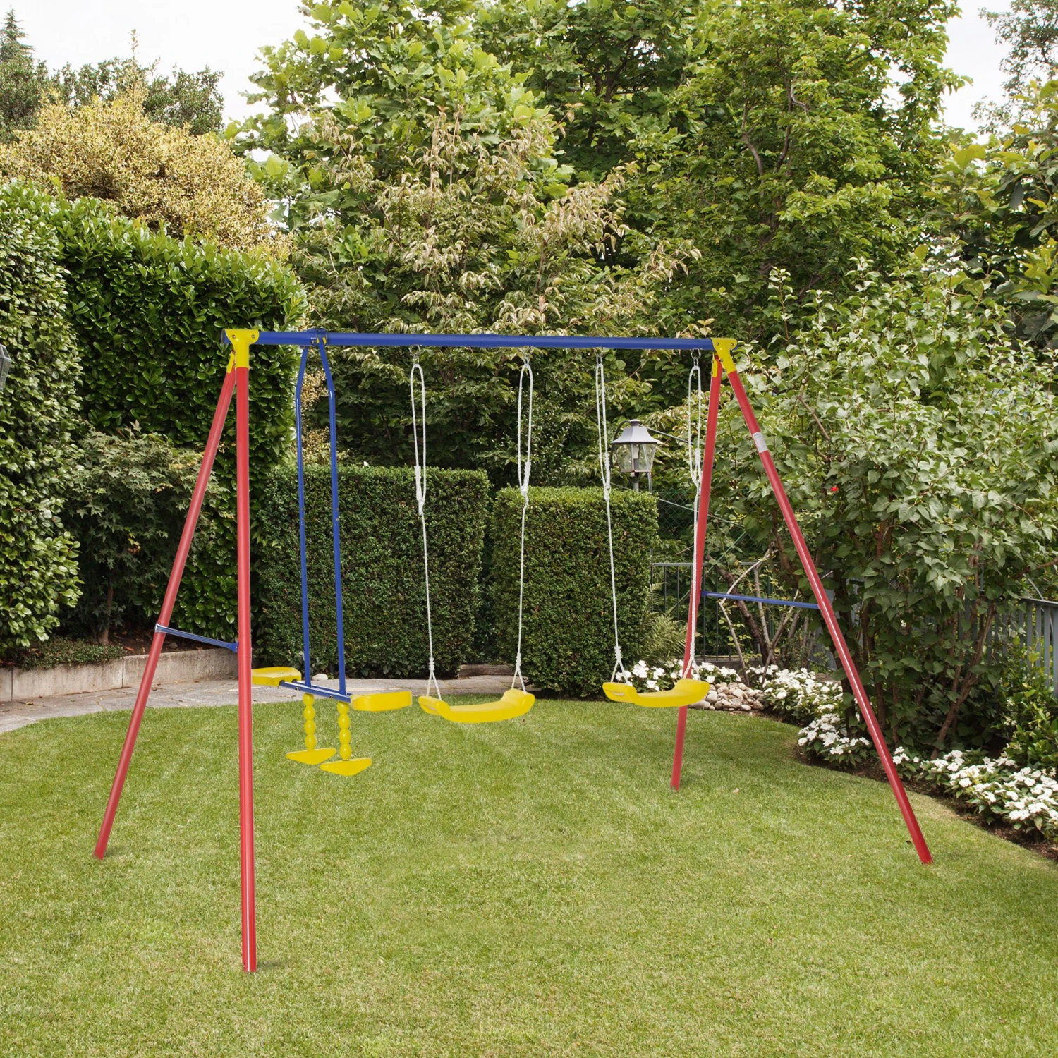 Enjoy the playground swings without leaving the backyard! This heavy duty swing set from Outsunny makes entertaining kids a breeze. Made with steel tubes and a powder coating finish, this kids swing has solid construction for daily use. Includes 2 swing seats and 1 glider for kids for a variety of fun. Recommended for kids from the ages of 3 to 5 years old.