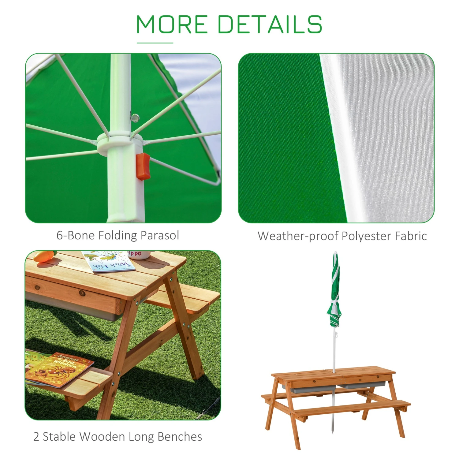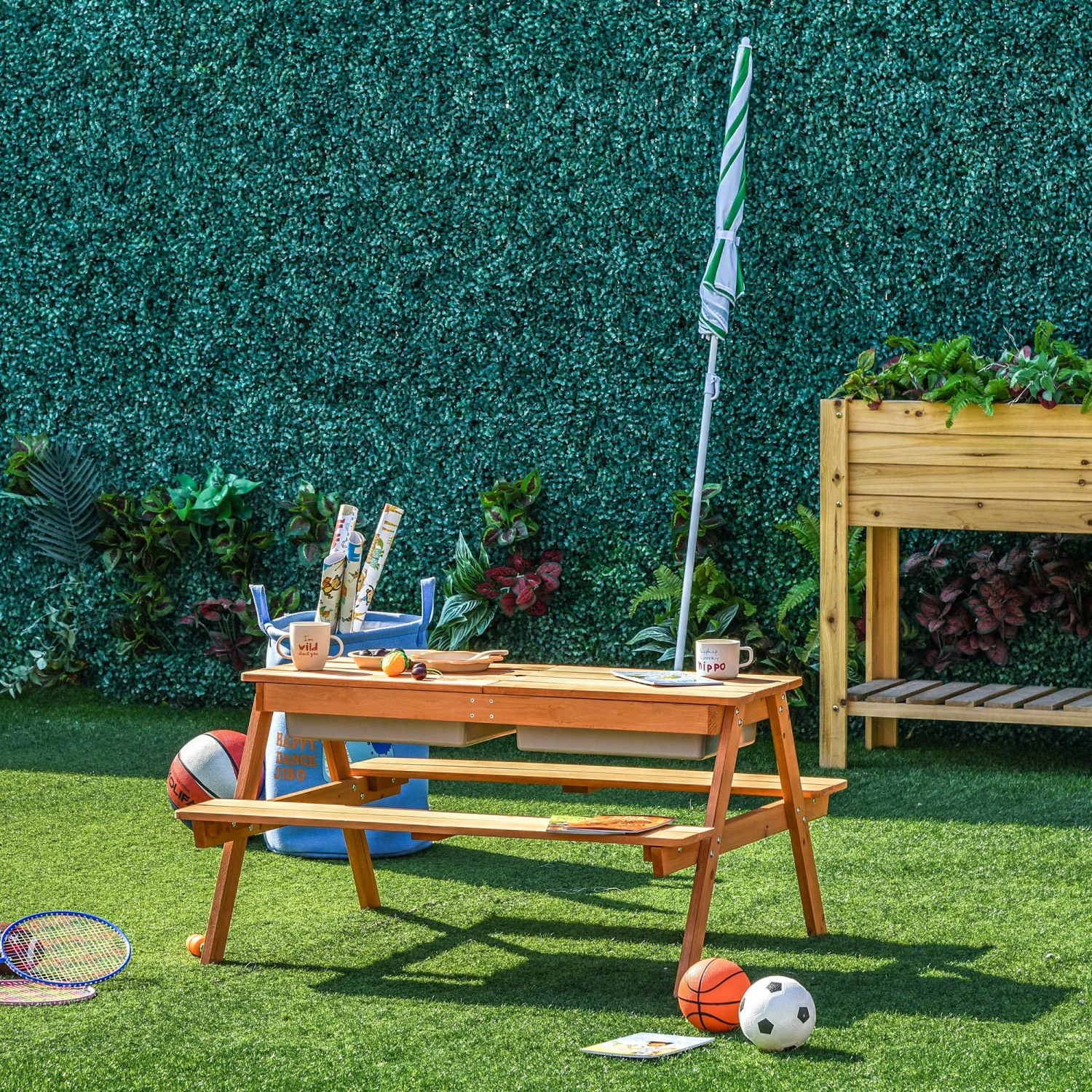 This kids outdoor table has plenty of seats for multiple children to eat meals and play games together. The materials are solid fir wood so you can provide them with stable furniture. Remove the top boards to reveal storage underneath for games and toys, or to access a place to set up a sandbox. An umbrella is included to keep your little ones cool and comfortable while they play or enjoy a snack. This Outsunny design is a shady place for fun.