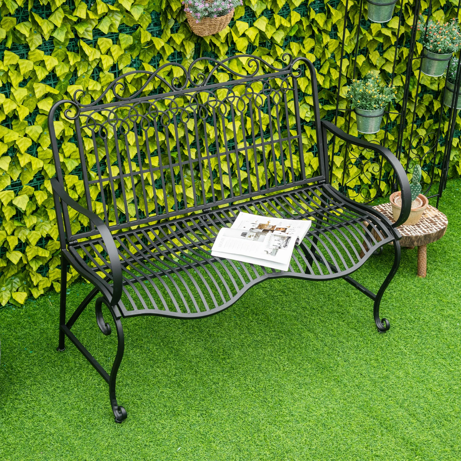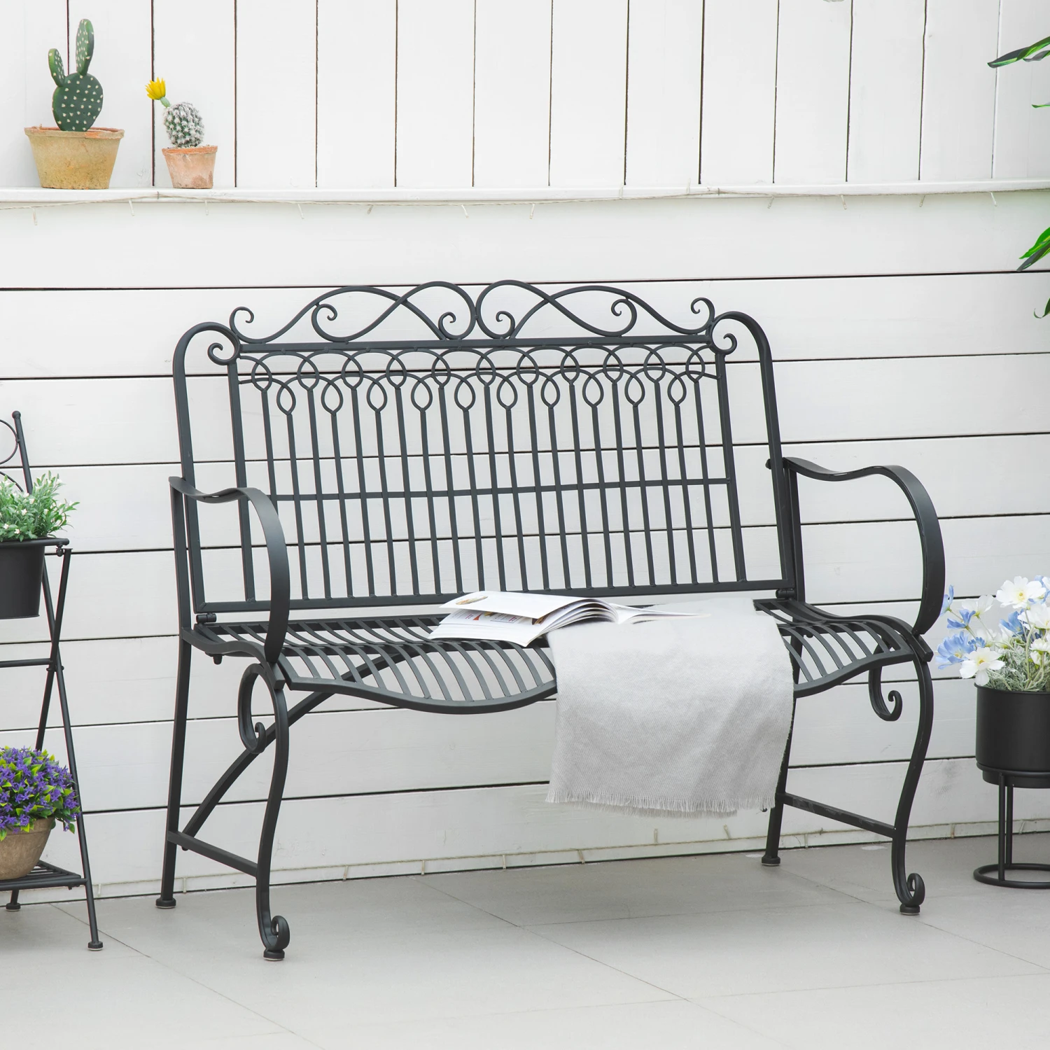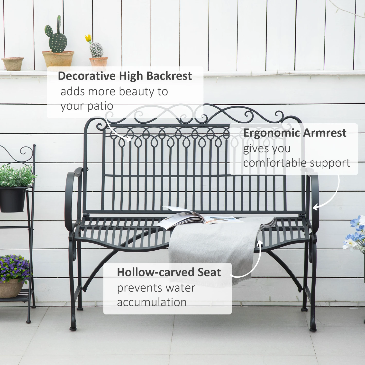 Sit back, relax and enjoy the summer with a friend and Outsunny. This park-style bench is like a loveseat for your lawn. Made of metal European scrollwork flourishes, it’s a striking centerpiece for your front porch. Built to withstand weight, water, and weather, it was formed with a sturdy twice-coated steel frame. First, with an electrophoretic process and second with a powder coating, it’s double protected. With a high-rise back, curved seat, and enough armrests for two to sit comfortably.