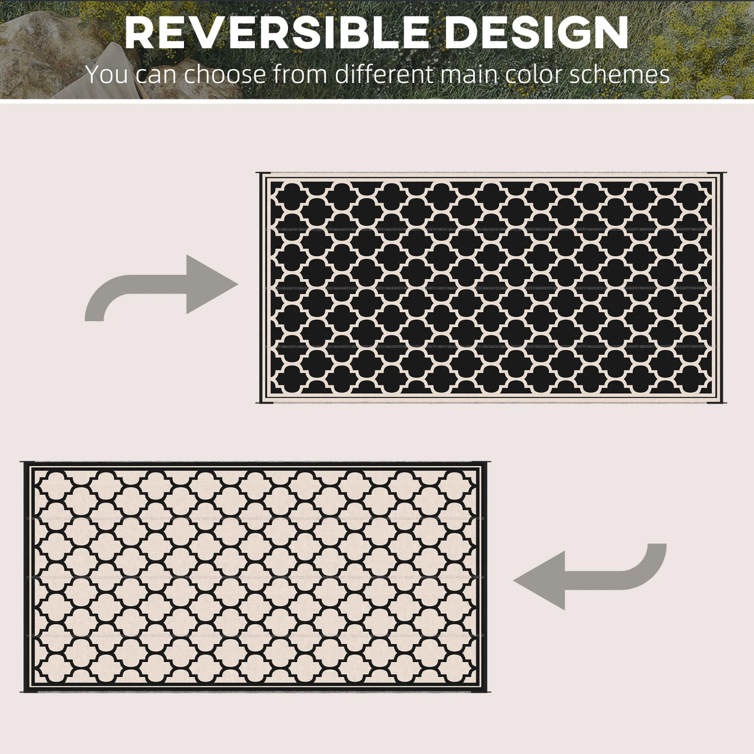 Camp out on the carpet with Outsunny. This waterproof carpet is a reversible outdoor rug designed to handle dirt. Outdoor-ready, this outdoor rug cleans up fast; sweep it, spray it, wipe it, or wave it; its powerful plastic fibers stay dry and don’t saturate. Keep our rug in the camper, RV, or car. It’s excellent for camping, beach barbecues, patio picnics, or anywhere you need it outside. The color is reversible, meaning you get two rug patterns in one package. Get out, get comfy, get Outsunny.