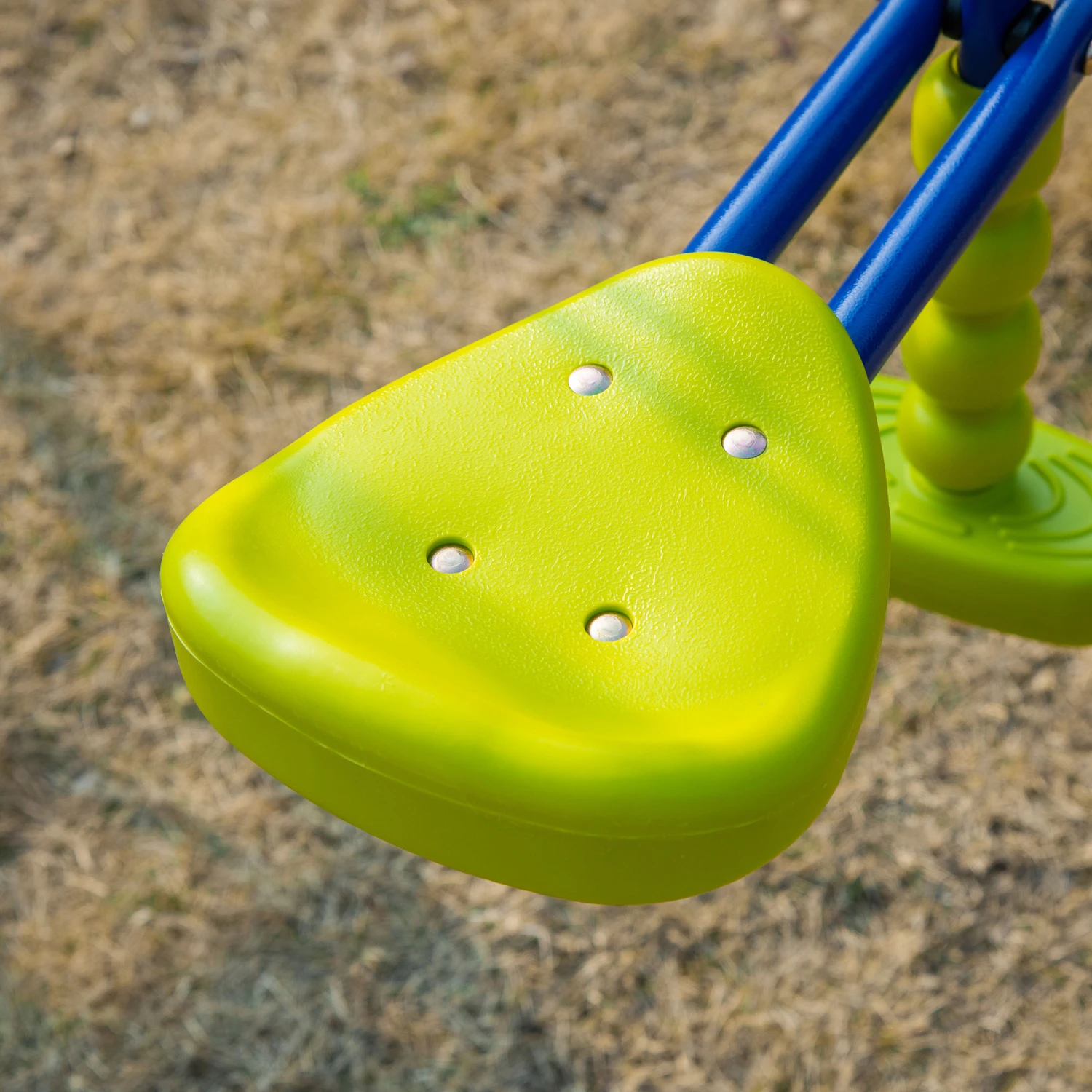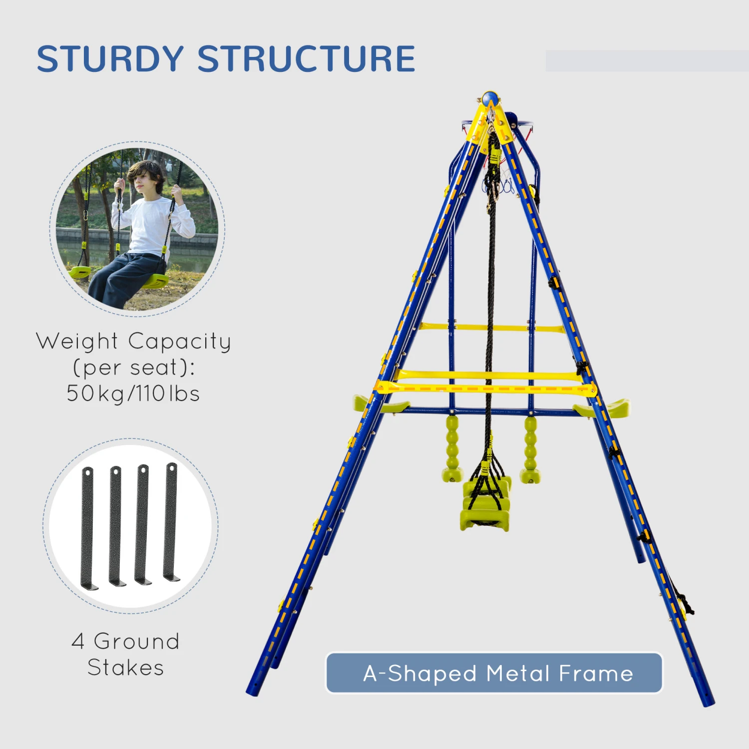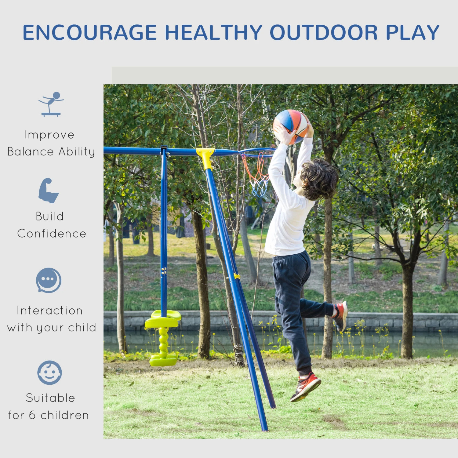 – Swing seats, glider, basketball hoop, climb a rope, and climb a ladder for four kids to play together