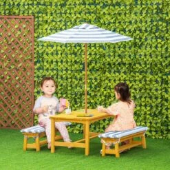 Outsunny Kids Wooden Table Bench Set, W/ Soft Cushions Removable Umbrella, Aged 3-8