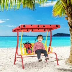 Outsunny 2-Seat Kids Patio Canopy Swing, W/ Adjustable Awning. Seat Belt, Ladybird Pattern