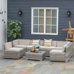 Outsunny 6PC Patio Furniture Set L-Shape Corner Sectional Sofa Set W/ Coffee Table Beige